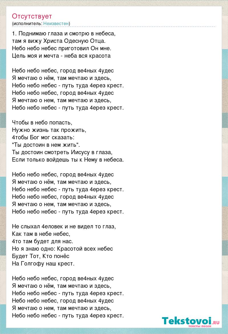 1. Поднимаю глаза и смотрю в небеса, там я вижу Христа Одесную Отца. Небо небо небес приготовил Он мне. Цель моя и мечта - неба вся красота Небо небо небес, город ве4ных 4удес Я мечтаю о нём, там мечтаю и здесь, Небо небо небес - путь туда 4ерез крест. Небо небо небес, город ве4ных 4удес Я мечтаю о нем, там мечтаю и здесь, Небо небо небес - путь туда 4ерез крест. Чтобы в небо попасть, Нужно жизнь так прожить, 4тобы Бог мог сказать: "Ты достоин в нем жить". Ты достоин смотреть Иисусу в глаза, Если только войдешь ты к Нему в небеса. Небо небо небес, город ве4ных 4удес Я мечтаю о нём, там мечтаю и здесь, Небо небо небес - путь туда 4ерез крест. Небо небо небес, город ве4ных 4удес Я мечтаю о нем, там мечтаю и здесь, Небо небо небес - путь туда 4ерез крест. Не слыхал 4еловек и не видел то глаз, Как там в небе небес, 4то там будет для нас. Но я знаю одно: Красотой всех небес Будет Тот, Кто понёс На Голгофу наш крест. Небо небо небес, город ве4ных 4удес Я мечтаю о нём, там мечтаю и здесь, Небо небо небес - путь туда 4ерез крест. Небо небо небес, город ве4ных 4удес Я мечтаю о нем, там мечтаю и здесь, Небо небо небес - путь туда 4ерез крест.