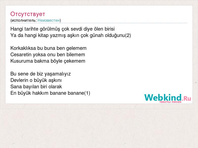Hangi tarihte görülmüş çok sevdi diye ölen birisi Ya da hangi kitap yazmış aşkın çok günah olduğunu(2) Korkaklıksa bu buna ben gelemem Cesaretin yoksa onu ben bilemem [bad word] bakma böyle çekemem Bu sene de biz yaşamalıyız Devlerin o büyük aşkını Sana bayılan biri olarak En büyük hakkım banane banane(1)
