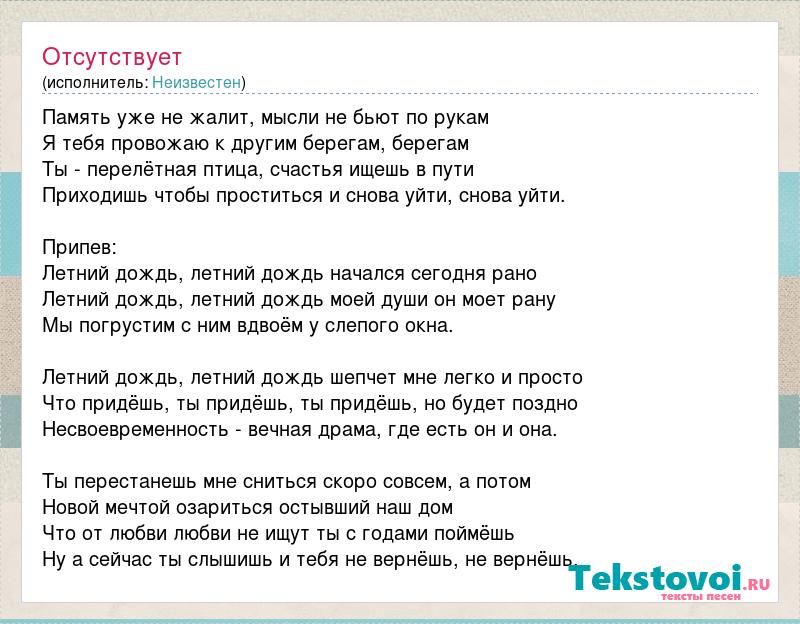 Память уже не жалит, мысли не бьют по рукам Я тебя провожаю к другим берегам, берегам Ты - перелётная птица, счастья ищешь в пути Приходишь чтобы проститься и снова уйти, снова уйти. Припев: Летний дождь, летний дождь начался сегодня рано Летний дождь, летний дождь моей души он моет рану Мы погрустим с ним вдвоём у слепого окна. Летний дождь, летний дождь шепчет мне легко и просто Что придёшь, ты придёшь, ты придёшь, но будет поздно Несвоевременность - вечная драма, где есть он и она. Ты перестанешь мне сниться скоро совсем, а потом Новой мечтой озариться остывший наш дом Что от любви любви не ищут ты с годами поймёшь Ну а сейчас ты слышишь и тебя не вернёшь, не вернёшь.