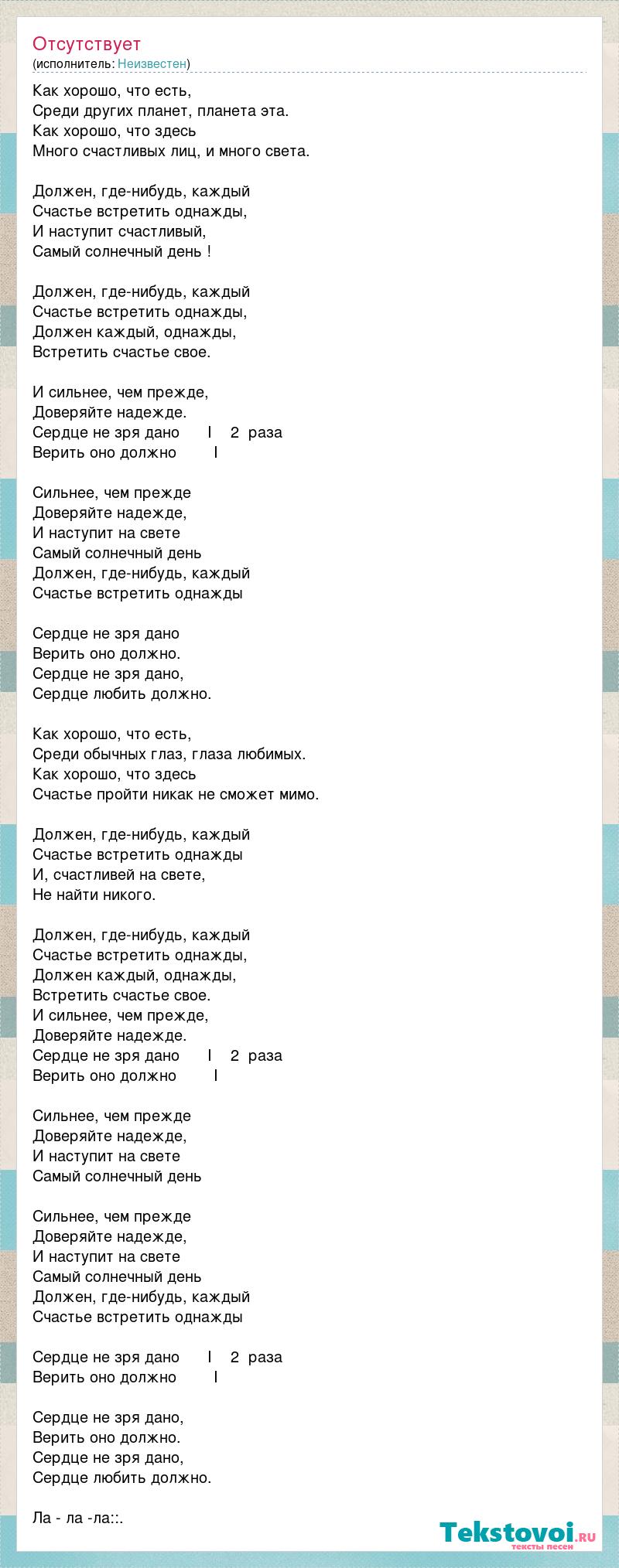 Как хорошо, что есть, Среди других планет, планета эта. Как хорошо, что здесь Много счастливых лиц, и много света. Должен, где-нибудь, каждый Счастье встретить однажды, И наступит счастливый, Самый солнечный день ! Должен, где-нибудь, каждый Счастье встретить однажды, Должен каждый, однажды, Встретить счастье свое. И сильнее, чем прежде, Доверяйте надежде. Сердце не зря дано I 2 раза Верить оно должно I Сильнее, чем прежде Доверяйте надежде, И наступит на свете Самый солнечный день Должен, где-нибудь, каждый Счастье встретить однажды Сердце не зря дано Верить оно должно. Сердце не зря дано, Сердце любить должно. Как хорошо, что есть, Среди обычных глаз, глаза любимых. Как хорошо, что здесь Счастье пройти никак не сможет мимо. Должен, где-нибудь, каждый Счастье встретить однажды И, счастливей на свете, Не найти никого. Должен, где-нибудь, каждый Счастье встретить однажды, Должен каждый, однажды, Встретить счастье свое. И сильнее, чем прежде, Доверяйте надежде. Сердце не зря дано I 2 раза Верить оно должно I Сильнее, чем прежде Доверяйте надежде, И наступит на свете Самый солнечный день Сильнее, чем прежде Доверяйте надежде, И наступит на свете Самый солнечный день Должен, где-нибудь, каждый Счастье встретить однажды Сердце не зря дано I 2 раза Верить оно должно I Сердце не зря дано, Верить оно должно. Сердце не зря дано, Сердце любить должно. Ла - ла -ла::.