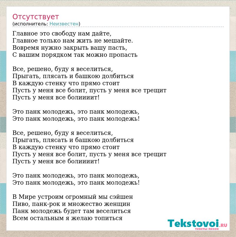 Главное это свободу нам дайте, Главное только нам жить не мешайте. Вовремя нужно закрыть вашу пасть, С вашим порядком так можно пропасть Все, решено, буду я веселиться, Прыгать, плясать и башкою долбиться В каждую стенку что прямо стоит Пусть у меня все болит, пусть у меня все трещит Пусть у меня все болиииит! Это панк молодежь, это панк молодежь, Это панк молодежь, это панк молодежь! Все, решено, буду я веселиться, Прыгать, плясать и башкою долбиться В каждую стенку что прямо стоит Пусть у меня все болит, пусть у меня все трещит Пусть у меня все болиииит! Это панк молодежь, это панк молодежь, Это панк молодежь, это панк молодежь! В Мире устроим огромный мы сэйшен Пиво, панк-рок и множество женщин Панк молодежь будет там веселиться Всем остальным я желаю топиться