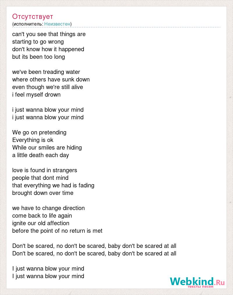 can't you see that things are starting to go wrong don't know how it happened but its been too long we've been treading water where others have sunk down even though we're still alive i feel myself drown i just wanna blow your mind i just wanna blow your mind We go on pretending Everything is ok While our smiles are hiding a little death each day love is found in strangers people that dont mind that everything we had is fading brought down over time we have to change [bad word] back to life again ignite our old affection before the point of no return is met Don't be scared, no don't be scared, baby don't be scared at all Don't be scared, no don't be scared, baby don't be scared at all I just wanna blow your mind I just wanna blow your mind