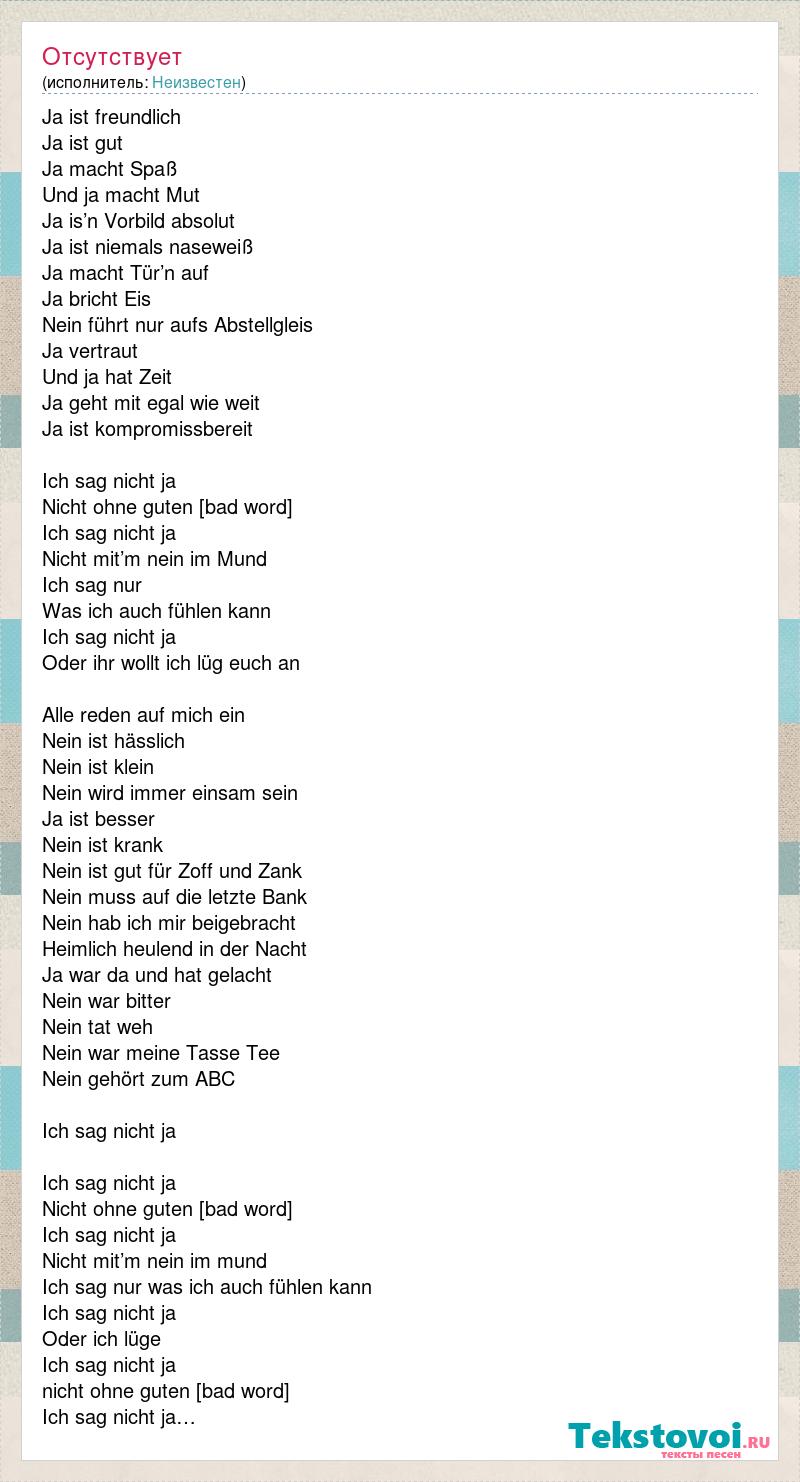 Ja ist freundlich Ja ist gut Ja macht Spaß Und ja macht Mut Ja is’n Vorbild absolut Ja ist niemals naseweiß Ja macht Tür’n auf Ja bricht Eis Nein führt nur aufs Abstellgleis Ja vertraut Und ja hat Zeit Ja geht mit egal wie weit Ja ist kompromissbereit Ich sag nicht ja Nicht ohne guten [bad word] Ich sag nicht ja Nicht mit’m nein im Mund Ich sag nur Was ich auch fühlen kann Ich sag nicht ja Oder ihr wollt ich lüg euch an Alle reden auf mich ein Nein ist hässlich Nein ist klein Nein wird immer einsam sein Ja ist besser Nein ist krank Nein ist gut für Zoff und Zank Nein muss auf die letzte Bank Nein hab ich mir beigebracht Heimlich heulend in der Nacht Ja war da und hat gelacht Nein war bitter Nein tat weh Nein war meine Tasse Tee Nein gehört zum ABC Ich sag nicht ja Ich sag nicht ja Nicht ohne guten [bad word] Ich sag nicht ja Nicht mit’m nein im mund Ich sag nur was ich auch fühlen kann Ich sag nicht ja Oder ich lüge Ich sag nicht ja nicht ohne guten [bad word] Ich sag nicht ja…