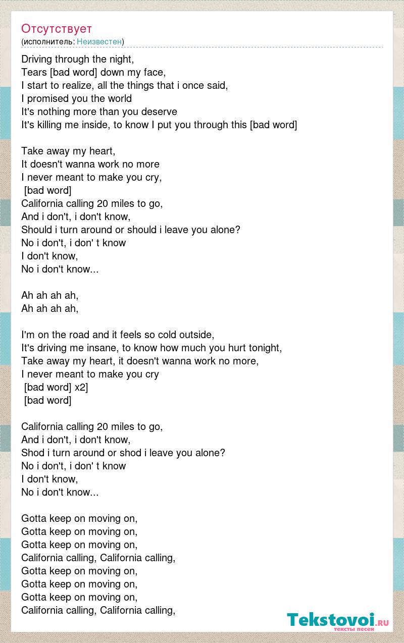Driving through the night, Tears [bad word] down my face, I start to realize, all the things that i once said, I promised you the world It's nothing more than you deserve It's killing me inside, to know I put you through this [bad word] Take away my heart, It doesn't wanna work no more I never meant to make you cry, [bad word] California calling 20 miles to go, And i don't, i don't know, Should i turn around or should i leave you alone? No i don't, i don' t know I don't know, No i don't know... Ah ah ah ah, Ah ah ah ah, I'm on the road and it feels so cold outside, It's driving me insane, to know how much you hurt tonight, Take away my heart, it doesn't wanna work no more, I never meant to make you cry [bad word] x2] [bad word] California calling 20 miles to go, And i don't, i don't know, Shod i turn around or shod i leave you alone? No i don't, i don' t know I don't know, No i don't know... Gotta keep on moving on, Gotta keep on moving on, Gotta keep on moving on, California calling, California calling, Gotta keep on moving on, Gotta keep on moving on, Gotta keep on moving on, California calling, California calling,