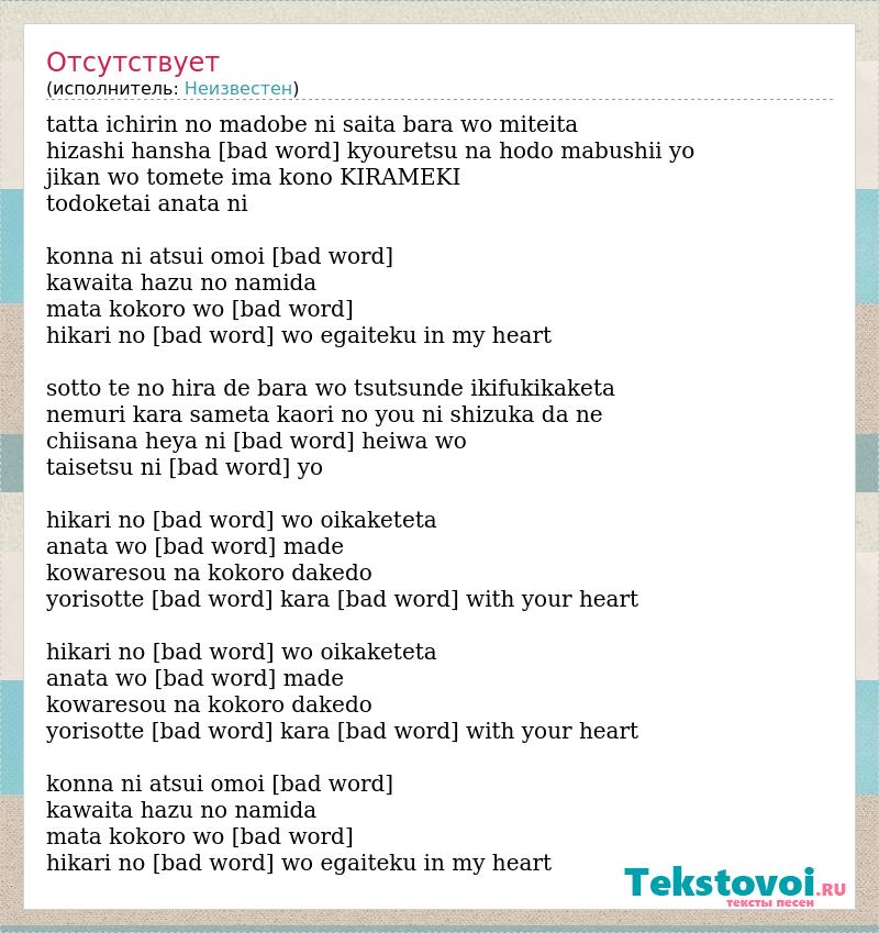 tatta ichirin no madobe ni saita bara wo miteita hizashi hansha [bad word] kyouretsu na hodo mabushii yo jikan wo tomete ima kono KIRAMEKI todoketai anata ni konna ni atsui omoi [bad word] kawaita hazu no namida mata kokoro wo [bad word] hikari no [bad word] wo egaiteku in my heart sotto te no hira de bara wo tsutsunde ikifukikaketa nemuri kara sameta kaori no you ni shizuka da ne chiisana heya ni [bad word] heiwa wo taisetsu ni [bad word] yo hikari no [bad word] wo oikaketeta anata wo [bad word] made kowaresou na kokoro dakedo yorisotte [bad word] kara [bad word] with your heart hikari no [bad word] wo oikaketeta anata wo [bad word] made kowaresou na kokoro dakedo yorisotte [bad word] kara [bad word] with your heart konna ni atsui omoi [bad word] kawaita hazu no namida mata kokoro wo [bad word] hikari no [bad word] wo egaiteku in my heart