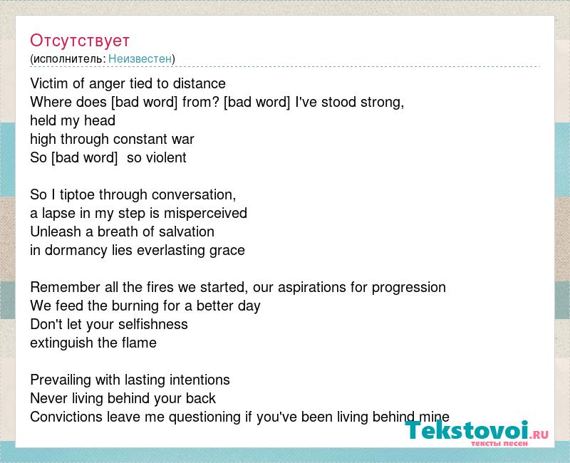Victim of anger tied to distance Where does [bad word] from? [bad word] I've stood strong, held my head high through constant war So [bad word] so violent So I tiptoe through conversation, a lapse in my step is misperceived Unleash a breath of salvation in dormancy lies everlasting grace Remember all the fires we started, our aspirations for progression We feed the burning for a better day Don't let your selfishness extinguish the flame Prevailing with lasting intentions Never living behind your back Convictions leave me questioning if you've been living behind mine