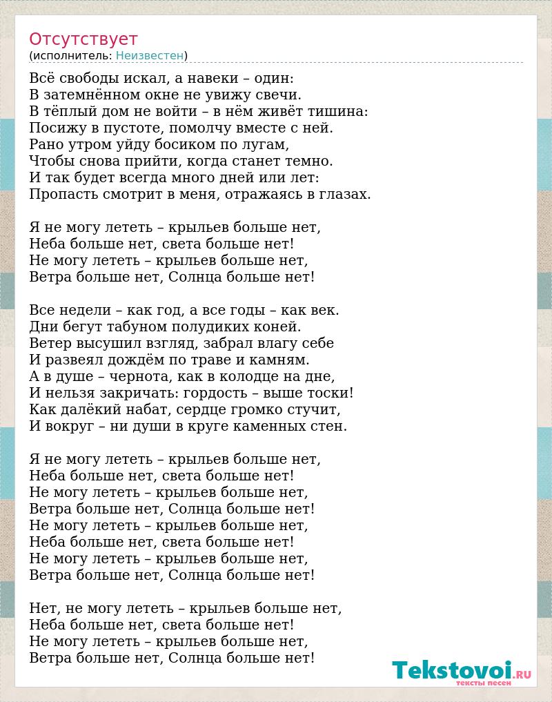 Всё свободы искал, а навеки – один: В затемнённом окне не увижу свечи. В тёплый дом не войти – в нём живёт тишина: Посижу в пустоте, помолчу вместе с ней. Рано утром уйду босиком по лугам, Чтобы снова прийти, когда станет темно. И так будет всегда много дней или лет: Пропасть смотрит в меня, отражаясь в глазах. Я не могу лететь – крыльев больше нет, Неба больше нет, света больше нет! Не могу лететь – крыльев больше нет, Ветра больше нет, Солнца больше нет! Все недели – как год, а все годы – как век. Дни бегут табуном полудиких коней. Ветер высушил взгляд, забрал влагу себе И развеял дождём по траве и камням. А в душе – чернота, как в колодце на дне, И нельзя закричать: гордость – выше тоски! Как далёкий набат, сердце громко стучит, И вокруг – ни души в круге каменных стен. Я не могу лететь – крыльев больше нет, Неба больше нет, света больше нет! Не могу лететь – крыльев больше нет, Ветра больше нет, Солнца больше нет! Не могу лететь – крыльев больше нет, Неба больше нет, света больше нет! Не могу лететь – крыльев больше нет, Ветра больше нет, Солнца больше нет! Нет, не могу лететь – крыльев больше нет, Неба больше нет, света больше нет! Не могу лететь – крыльев больше нет, Ветра больше нет, Солнца больше нет!