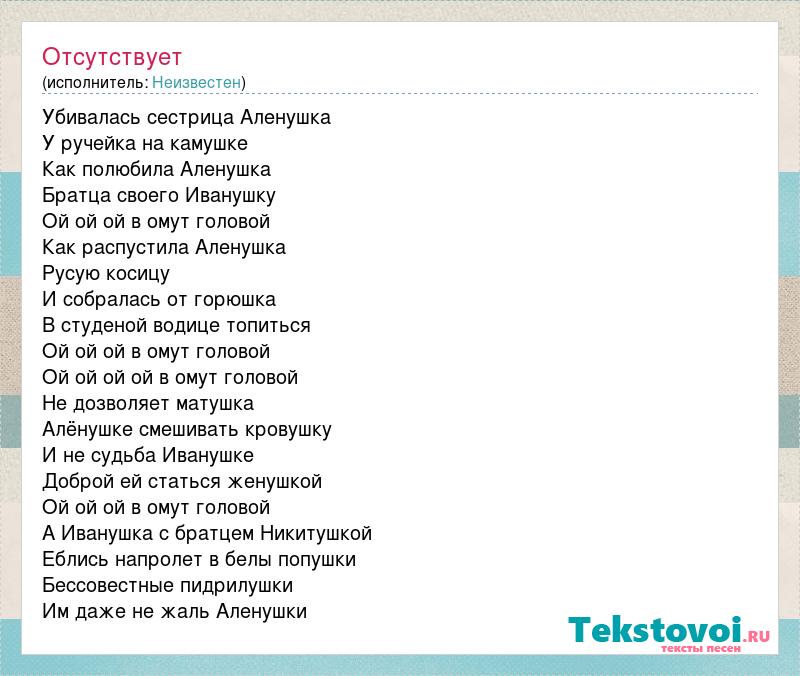 Убивалась сестрица Аленушка У ручейка на камушке Как полюбила Аленушка Братца своего Иванушку Ой ой ой в омут головой Как распустила Аленушка Русую косицу И собралась от горюшка В студеной водице топиться Ой ой ой в омут головой Ой ой ой ой в омут головой Не дозволяет матушка Алёнушке смешивать кровушку И не судьба Иванушке Доброй ей статься женушкой Ой ой ой в омут головой А Иванушка с братцем Никитушкой Еблись напролет в белы попушки Бессовестные пидрилушки Им даже не жаль Аленушки