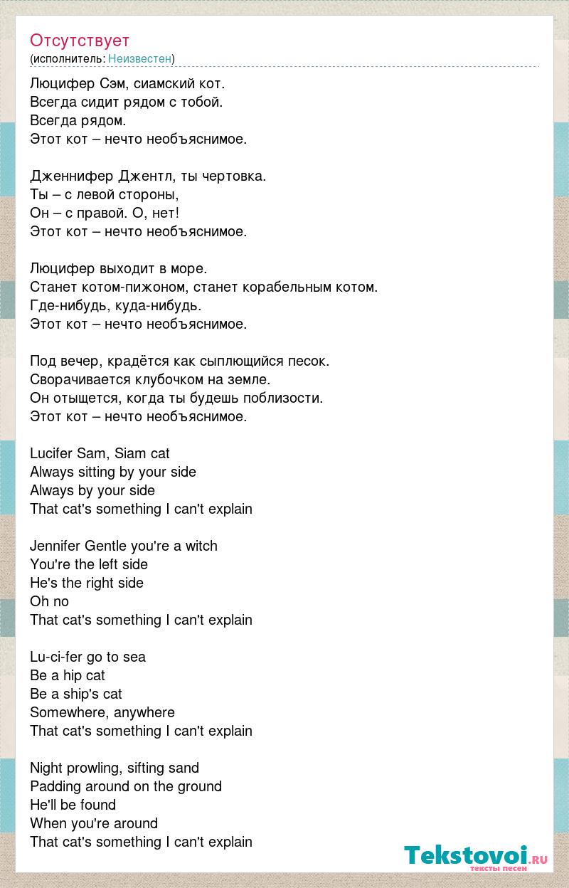 Люцифер Сэм, сиамский кот. Всегда сидит рядом с тобой. Всегда рядом. Этот кот – нечто необъяснимое. Дженнифер Джентл, ты чертовка. Ты – с левой стороны, Он – с правой. О, нет! Этот кот – нечто необъяснимое. Люцифер выходит в море. Станет котом-пижоном, станет корабельным котом. Где-нибудь, куда-нибудь. Этот кот – нечто необъяснимое. Под вечер, крадётся как сыплющийся песок. Сворачивается клубочком на земле. Он отыщется, когда ты будешь поблизости. Этот кот – нечто необъяснимое. Lucifer Sam, Siam cat Always sitting by your side Always by your side That cat's something I can't explain Jennifer Gentle you're a witch You're the left side He's the right side Oh no That cat's something I can't explain Lu-ci-fer go to sea Be a hip cat Be a ship's cat Somewhere, anywhere That cat's something I can't explain Night prowling, sifting sand Padding around on the ground He'll be found When you're around That cat's something I can't explain