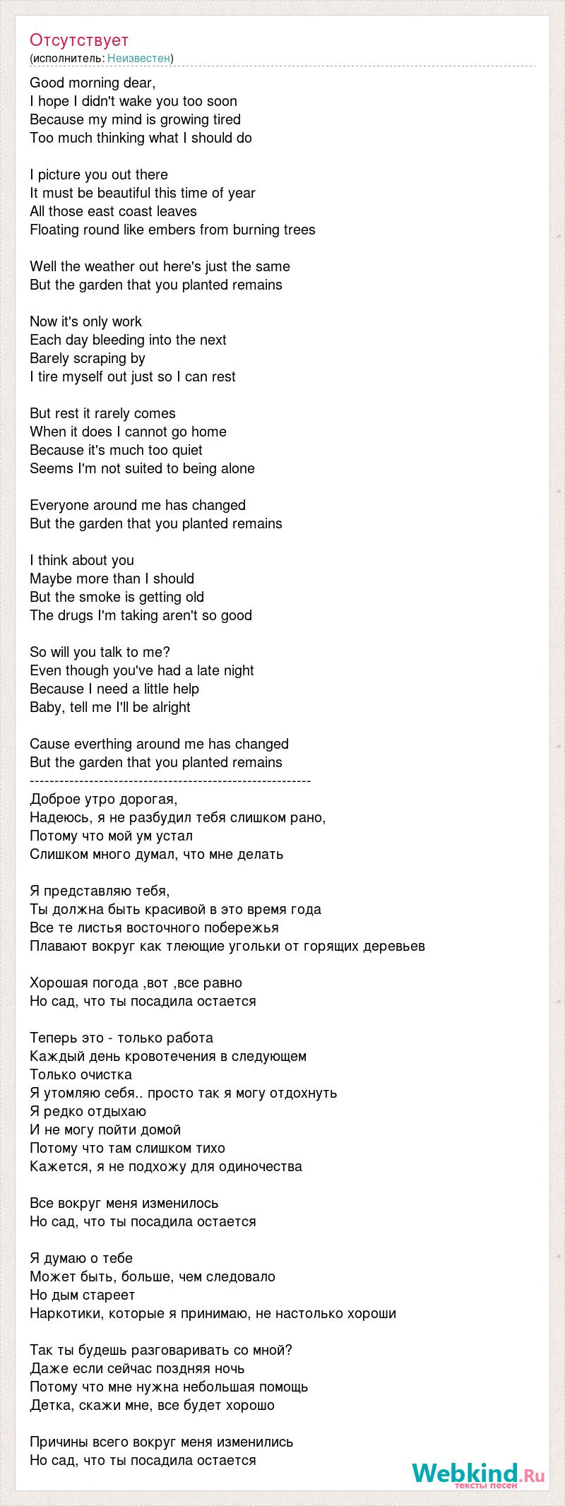 Good morning dear, I hope I didn't wake you too soon Because my mind is growing tired Too much thinking what I should do I picture you out there It must be beautiful this time of year All those east coast leaves Floating round like embers from burning trees Well the weather out here's just the same But the garden that you planted remains Now it's only work Each day bleeding into the next Barely scraping by I tire myself out just so I can rest But rest it [bad word] When it does I cannot go home Because it's much too quiet Seems I'm not suited to being alone Everyone around me has changed But the garden that you planted remains I think about you Maybe more than I should But the smoke is getting old The [bad word] I'm taking aren't so good So will you talk to me? Even though you've had a late night Because I need a little help Baby, tell me I'll be alright Cause everthing around me has changed But the garden that you planted remains --------------------------------------------------------- Доброе утро дорогая, Надеюсь, я не разбудил тебя слишком рано, Потому что мой ум устал Слишком много думал, что мне делать Я представляю тебя, Ты должна быть красивой в это время года Все те листья восточного побережья Плавают вокруг как тлеющие угольки от горящих деревьев Хорошая погода ,вот ,все равно Но сад, что ты посадила остается Теперь это - только работа Каждый день кровотечения в следующем Только очистка Я утомляю себя.. просто так я могу отдохнуть Я редко отдыхаю И не могу пойти домой Потому что там слишком тихо Кажется, я не подхожу для одиночества Все вокруг меня изменилось Но сад, что ты посадила остается Я думаю о тебе Может быть, больше, чем следовало Но дым стареет Наркотики, которые я принимаю, не настолько хороши Так ты будешь разговаривать со мной? Даже если сейчас поздняя ночь Потому что мне нужна небольшая помощь Детка, скажи мне, все будет хорошо Причины всего вокруг меня изменились Но сад, что ты посадила остается