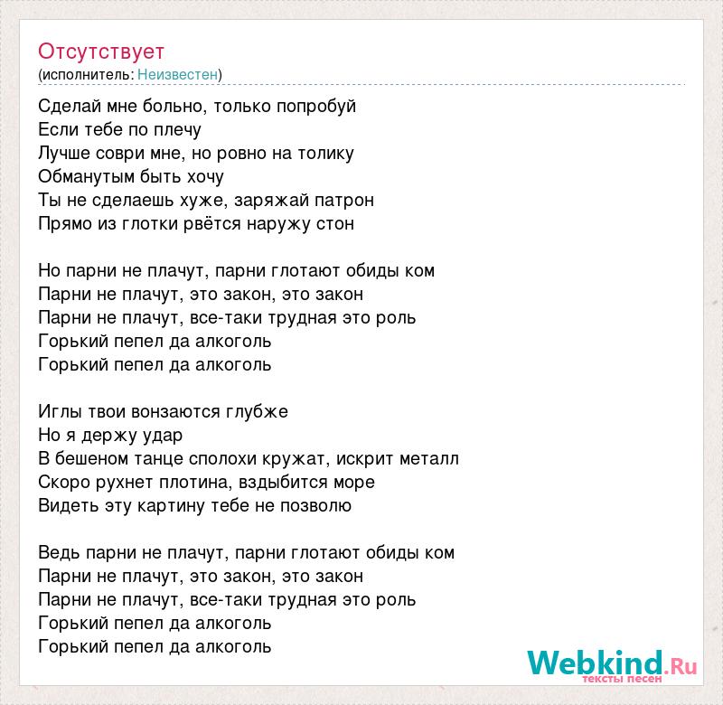 Сделай мне больно, только попробуй Если тебе по плечу Лучше соври мне, но ровно на толику Обманутым быть хочу Ты не сделаешь хуже, заряжай патрон Прямо из глотки рвётся наружу стон Но парни не плачут, парни глотают обиды ком Парни не плачут, это закон, это закон Парни не плачут, все-таки трудная это роль Горький пепел да алкоголь Горький пепел да алкоголь Иглы твои вонзаются глубже Но я держу удар В бешеном танце сполохи кружат, искрит металл Скоро рухнет плотина, вздыбится море Видеть эту картину тебе не позволю Ведь парни не плачут, парни глотают обиды ком Парни не плачут, это закон, это закон Парни не плачут, все-таки трудная это роль Горький пепел да алкоголь Горький пепел да алкоголь