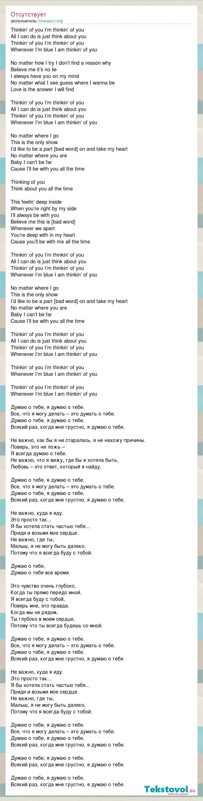 Thinkin‘ of you I’m thinkin‘ of you All I can do is just think about you Thinkin‘ of you I’m thinkin‘ of you Whenever I’m blue I am thinkin‘ of you No matter how I try I don’t find a reason why Believe me it’s no lie I always have you on my mind No matter what I see guess where I wanna be Love is the answer I will find Thinkin‘ of you I’m thinkin‘ of you All I can do is just think about you Thinkin‘ of you I’m thinkin‘ of you Whenever I’m blue I am thinkin‘ of you No matter where I go This is the only show I’d like to be a part [bad word] on and take my heart No matter where you are Baby I can’t be far Cause I’ll be with you all the time Thinking of you Think about you all the time This feelin‘ deep inside When you’re right by my side I’ll always be with you Believe me this is [bad word] Whenever we apart You’re deep with in my heart Cause you’ll be with me all the time Thinkin‘ of you I’m thinkin‘ of you All I can do is just think about you Thinkin‘ of you I’m thinkin‘ of you Whenever I’m blue I am thinkin‘ of you No matter where I go This is the only show I’d like to be a part [bad word] on and take my heart No matter where you are Baby I can’t be far Cause I’ll be with you all the time Thinkin‘ of you I’m thinkin‘ of you All I can do is just think about you Thinkin‘ of you I’m thinkin‘ of you Whenever I’m blue I am thinkin‘ of you Thinkin‘ of you I’m thinkin‘ of you Whenever I’m blue I am thinkin‘ of you Thinkin‘ of you I’m thinkin‘ of you Whenever I’m blue I am thinkin‘ of you Думаю о тебе, я думаю о тебе. Все, что я могу делать – это думать о тебе. Думаю о тебе, я думаю о тебе. Всякий раз, когда мне грустно, я думаю о тебе. Не важно, как бы я ни старалась, я не нахожу причины. Поверь, это не ложь – Я всегда думаю о тебе. Не важно, что я вижу, где бы я хотела быть, Любовь – это ответ, который я найду. Думаю о тебе, я думаю о тебе. Все, что я могу делать – это думать о тебе. Думаю о тебе, я думаю о тебе. Всякий раз, когда мне грустно, я думаю о тебе. Не важно, куда я иду. Это просто так... Я бы хотела стать частью тебя... Приди и возьми мое сердце. Не важно, где ты, Малыш, я не могу быть далеко, Потому что я всегда буду с тобой. Думаю о тебе, Думаю о тебе все время. Это чувство очень глубоко, Когда ты прямо передо мной. Я всегда буду с тобой, Поверь мне, это правда. Когда мы не рядом, Ты глубоко в моем сердце, Потому что ты всегда будешь со мной. Думаю о тебе, я думаю о тебе. Все, что я могу делать – это думать о тебе. Думаю о тебе, я думаю о тебе. Всякий раз, когда мне грустно, я думаю о тебе. Не важно, куда я иду. Это просто так... Я бы хотела стать частью тебя... Приди и возьми мое сердце. Не важно, где ты, Малыш, я не могу быть далеко, Потому что я всегда буду с тобой. Думаю о тебе, я думаю о тебе. Все, что я могу делать – это думать о тебе. Думаю о тебе, я думаю о тебе. Всякий раз, когда мне грустно, я думаю о тебе. Думаю о тебе, я думаю о тебе. Всякий раз, когда мне грустно, я думаю о тебе. Думаю о тебе, я думаю о тебе. Всякий раз, когда мне грустно, я думаю о тебе.