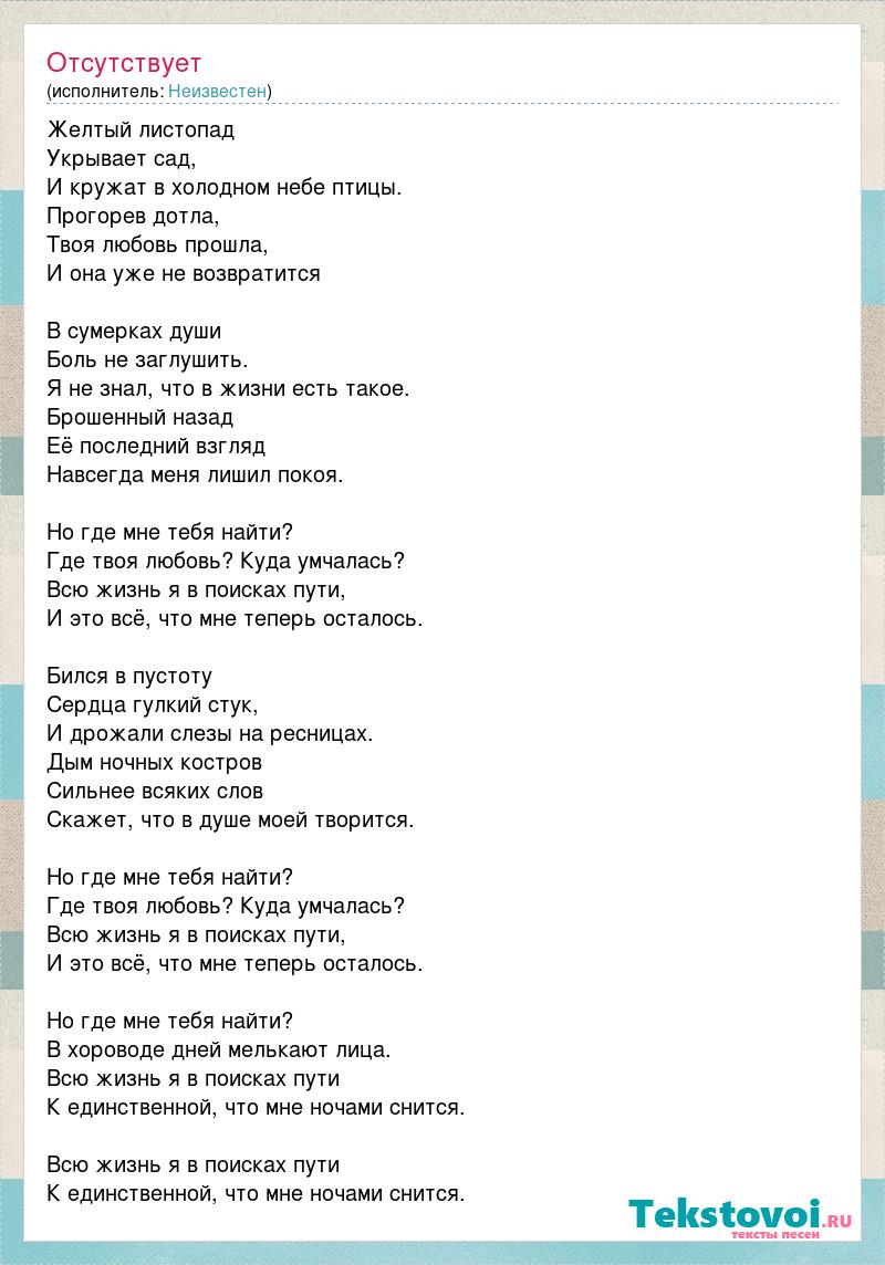 Желтый листопад Укрывает сад, И кружат в холодном небе птицы. Прогорев дотла, Твоя любовь прошла, И она уже не возвратится В сумерках души Боль не заглушить. Я не знал, что в жизни есть такое. Брошенный назад Её последний взгляд Навсегда меня лишил покоя. Но где мне тебя найти? Где твоя любовь? Куда умчалась? Всю жизнь я в поисках пути, И это всё, что мне теперь осталось. Бился в пустоту Сердца гулкий стук, И дрожали слезы на ресницах. Дым ночных костров Сильнее всяких слов Скажет, что в душе моей творится. Но где мне тебя найти? Где твоя любовь? Куда умчалась? Всю жизнь я в поисках пути, И это всё, что мне теперь осталось. Но где мне тебя найти? В хороводе дней мелькают лица. Всю жизнь я в поисках пути К единственной, что мне ночами снится. Всю жизнь я в поисках пути К единственной, что мне ночами снится.