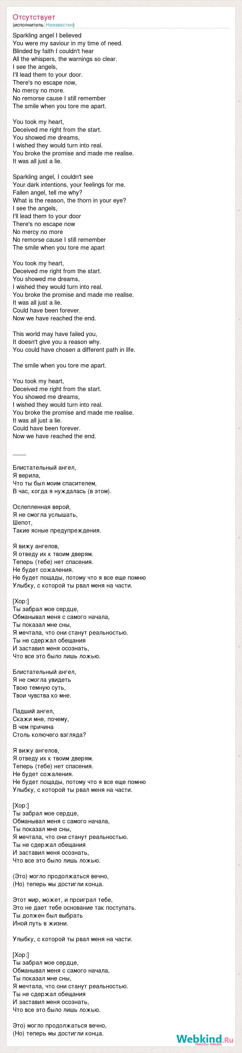 Sparkling angel I believed You were my saviour in my time of need. Blinded by faith I couldn't hear All the whispers, the warnings so clear. I see the angels, I'll lead them to your door. There's no escape now, No mercy no more. No remorse cause I still remember The smile when you tore me apart. You took my heart, Deceived me right from the start. You showed me dreams, I wished they would turn into real. You broke the promise and made me realise. It was all just a lie. Sparkling angel, I couldn't see Your dark intentions, your feelings for me. Fallen angel, tell me why? What is the reason, the thorn in your eye? I see the angels, I'll lead them to your door There's no escape now No mercy no more No remorse cause I still remember The smile when you tore me apart You took my heart, Deceived me right from the start. You showed me dreams, I wished they would turn into real. You broke the promise and made me realise. It was all just a lie. Could have been forever. Now we have reached the end. This world may have failed you, It doesn't give you a reason why. You could have chosen a different path in life. The smile when you tore me apart. You took my heart, Deceived me right from the start. You showed me dreams, I wished they would turn into real. You broke the promise and made me realise. It was all just a lie. Could have been forever. Now we have reached the end. ____ Блистательный ангел, Я верила, Что ты был моим спасителем, В час, когда я нуждалась (в этом). Ослепленная верой, Я не смогла услышать, Шепот, Такие ясные предупреждения. Я вижу ангелов, Я отведу их к твоим дверям. Теперь (тебе) нет спасения. Не будет сожаления. Не будет пощады, потому что я все еще помню Улыбку, с которой ты рвал меня на части. [Хор:] Ты забрал мое сердце, Обманывал меня с самого начала, Ты показал мне сны, Я мечтала, что они станут реальностью. Ты не сдержал обещания И заставил меня осознать, Что все это было лишь ложью. Блистательный ангел, Я не смогла увидеть Твою темную суть, Твои чувства ко мне. Падший ангел, Скажи мне, почему, В чем причина Столь колючего взгляда? Я вижу ангелов, Я отведу их к твоим дверям. Теперь (тебе) нет спасения. Не будет сожаления. Не будет пощады, потому что я все еще помню Улыбку, с которой ты рвал меня на части. [Хор:] Ты забрал мое сердце, Обманывал меня с самого начала, Ты показал мне сны, Я мечтала, что они станут реальностью. Ты не сдержал обещания И заставил меня осознать, Что все это было лишь ложью. (Это) могло продолжаться вечно, (Но) теперь мы достигли конца. Этот мир, может, и проиграл тебе, Это не дает тебе основание так поступать. Ты должен был выбрать Иной путь в жизни. Улыбку, с которой ты рвал меня на части. [Хор:] Ты забрал мое сердце, Обманывал меня с самого начала, Ты показал мне сны, Я мечтала, что они станут реальностью. Ты не сдержал обещания И заставил меня осознать, Что все это было лишь ложью. Это) могло продолжаться вечно, (Но) теперь мы достигли конца.