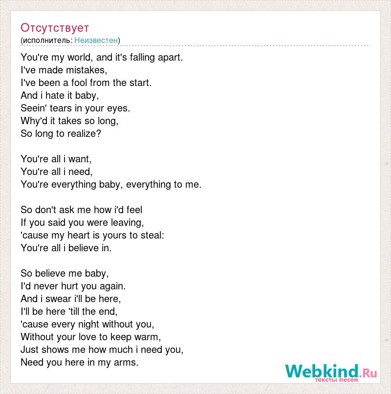 You're my world, and it's falling apart. I've made mistakes, I've been a fool from the start. And i hate it baby, Seein' tears in your eyes. Why'd it takes so long, So long to realize? You're all i want, You're all i need, You're everything baby, everything to me. So don't ask me how i'd feel If you said you were leaving, 'cause my heart is yours to steal: You're all i believe in. So believe me baby, I'd never hurt you again. And i swear i'll be here, I'll be here 'till the end, 'cause every night without you, Without your love to keep warm, Just shows me how much i need you, Need you here in my arms.