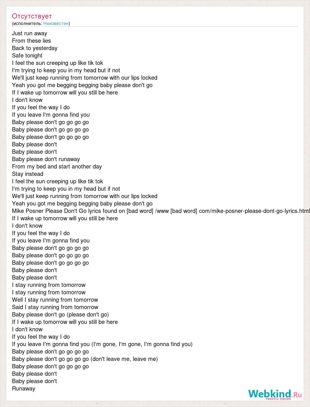 [bad word] away From these lies Back to yesterday Safe tonight I feel the sun creeping up like tik tok I'm trying to keep you in my head but if not We'll just [bad word] from tomorrow with our lips locked Yeah you got me begging begging baby please don't go If I wake up tomorrow will you still be here I don't know If you feel the way I do If you leave I'm gonna find you Baby please don't go go go go Baby please don't go go go go Baby please don't go go go go Baby please don't Baby please don't Baby please [bad word] From my bed and start another day Stay instead I feel the sun creeping up like tik tok I'm trying to keep you in my head but if not We'll just [bad word] from tomorrow with our lips locked Yeah you got me begging begging baby please don't go Mike Posner Please Don't Go lyrics found on [bad word] /www [bad [bad word] mike-posner-please-dont-go-lyrics.html If I wake up tomorrow will you still be here I don't know If you feel the way I do If you leave I'm gonna find you Baby please don't go go go go Baby please don't go go go go Baby please don't go go go go Baby please don't Baby please don't I [bad word] from tomorrow I [bad word] from tomorrow Well I [bad word] from tomorrow Said I [bad word] from tomorrow Baby please don't go (please don't go) If I wake up tomorrow will you still be here I don't know If you feel the way I do If you leave I'm gonna find you (I'm gone, I'm gone, I'm gonna find you) Baby please don't go go go go Baby please don't go go go go (don't leave me, leave me) Baby please don't go go go go Baby please don't Baby please don't [bad word]