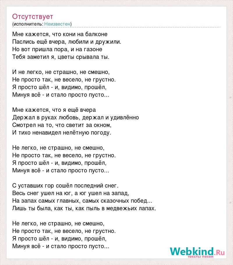 Мне кажется, что кони на балконе Паслись ещё вчера, любили и дружили. Но вот пришла пора, и на газоне Тебя заметил я, цветы срывала ты. И не легко, не страшно, не смешно, Не просто так, не весело, не грустно. Я просто шёл - и, видимо, прошёл, Минуя всё - и стало просто пусто... Мне кажется, что я ещё вчера Держал в руках любовь, держал и удивлённо Смотрел на то, что светит за окном, И тихо ненавидел нелётную погоду. Не легко, не страшно, не смешно, Не просто так, не весело, не грустно. Я просто шёл - и, видимо, прошёл, Минуя всё - и стало просто пусто... С уставших гор сошёл последний снег. Весь снег ушел на юг, а юг ушел на запад, На запах самых главных, самых сказочных побед... Лишь ты была, как ты, как пыль в медвежьих лапах. Не легко, не страшно, не смешно, Не просто так, не весело, не грустно. Я просто шёл - и, видимо, прошёл, Минуя всё - и стало просто пусто...