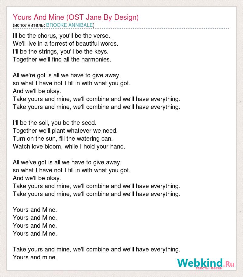 Ill be the [bad word] you'll be the verse. We'll live in a forrest of beautiful words. I'll be the strings, you'll be the keys. Together we'll find all the harmonies. All we're got is all we have to give away, so what I have not I fill in with what you got. And we'll be okay. Take yours and mine, [bad word] and we'll have everything. Take yours and mine, [bad word] and we'll have everything. I'll be the soil, you be the seed. Together we'll plant whatever we need. Turn on the sun, fill the watering can. Watch love bloom, while I hold your hand. All we've got is all we have to give away, so what I have not I fill in with what you got. And we'll be okay. Take yours and mine, [bad word] and we'll have everything. Take yours and mine, [bad word] and we'll have everything. Yours and Mine. Yours and Mine. Yours and Mine. Yours and Mine. Take yours and mine, [bad word] and we'll have everything. Yours and mine.
