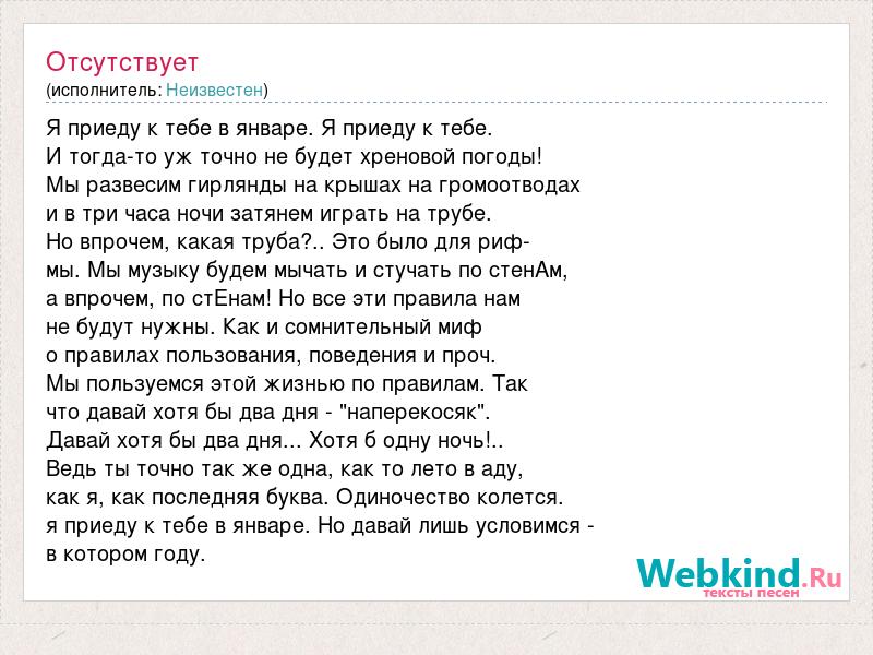 Я приеду к тебе в январе. Я приеду к тебе. И тогда-то уж точно не будет хреновой погоды! Мы развесим гирлянды на крышах на громоотводах и в три часа ночи затянем играть на трубе. Но впрочем, какая труба?.. Это было для риф- мы. Мы музыку будем мычать и стучать по стенАм, а впрочем, по стЕнам! Но все эти правила нам не будут нужны. Как и сомнительный миф о правилах пользования, поведения и проч. Мы пользуемся этой жизнью по правилам. Так что давай хотя бы два дня - "наперекосяк". Давай хотя бы два дня... Хотя б одну ночь!.. Ведь ты точно так же одна, как то лето в аду, как я, как последняя буква. Одиночество колется. я приеду к тебе в январе. Но давай лишь условимся - в котором году.