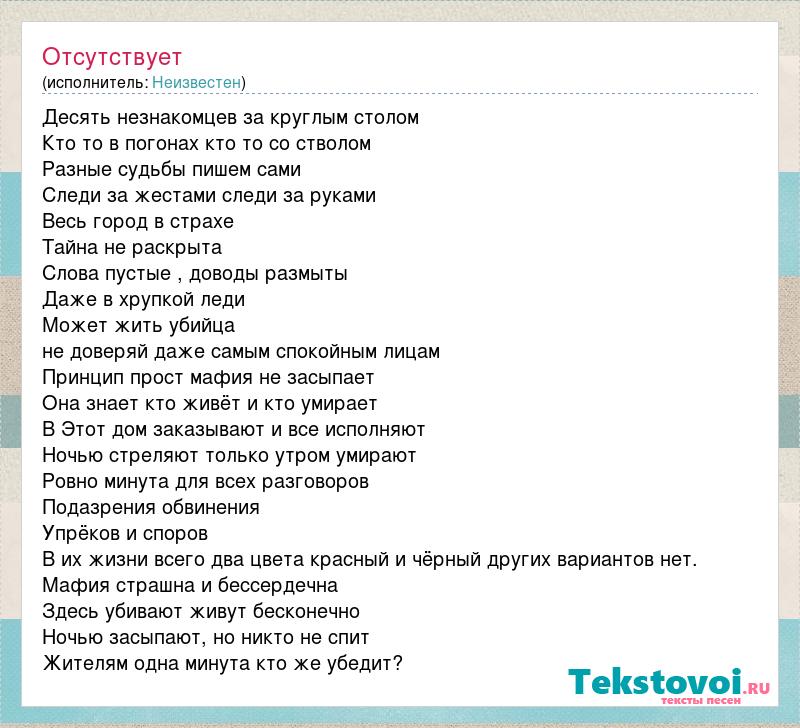 Десять незнакомцев за круглым столом Кто то в погонах кто то со стволом Разные судьбы пишем сами Следи за жестами следи за руками Весь город в страхе Тайна не раскрыта Слова пустые , доводы размыты Даже в хрупкой леди Может жить убийца не доверяй даже самым спокойным лицам Принцип прост мафия не засыпает Она знает кто живёт и кто умирает В Этот дом заказывают и все исполняют Ночью стреляют только утром умирают Ровно минута для всех разговоров Подазрения обвинения Упрёков и споров В их жизни всего два цвета красный и чёрный других вариантов нет. Мафия страшна и бессердечна Здесь убивают живут бесконечно Ночью засыпают, но никто не спит Жителям одна минута кто же убедит?