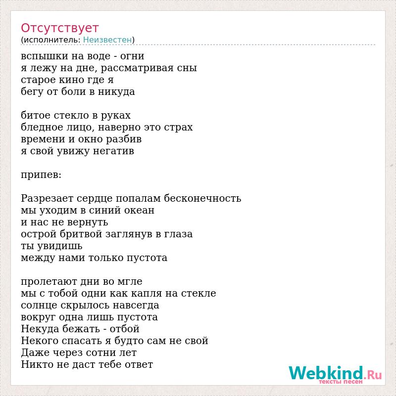 вспышки на воде - огни я лежу на дне, рассматривая сны старое кино где я бегу от боли в никуда битое стекло в руках бледное лицо, наверно это страх времени и окно разбив я свой увижу негатив припев: Разрезает сердце попалам бесконечность мы уходим в синий океан и нас не вернуть острой бритвой заглянув в глаза ты увидишь между нами только пустота пролетают дни во мгле мы с тобой одни как капля на стекле солнце скрылось навсегда вокруг одна лишь пустота Некуда бежать - отбой Некого спасать я будто сам не свой Даже через сотни лет Никто не даст тебе ответ