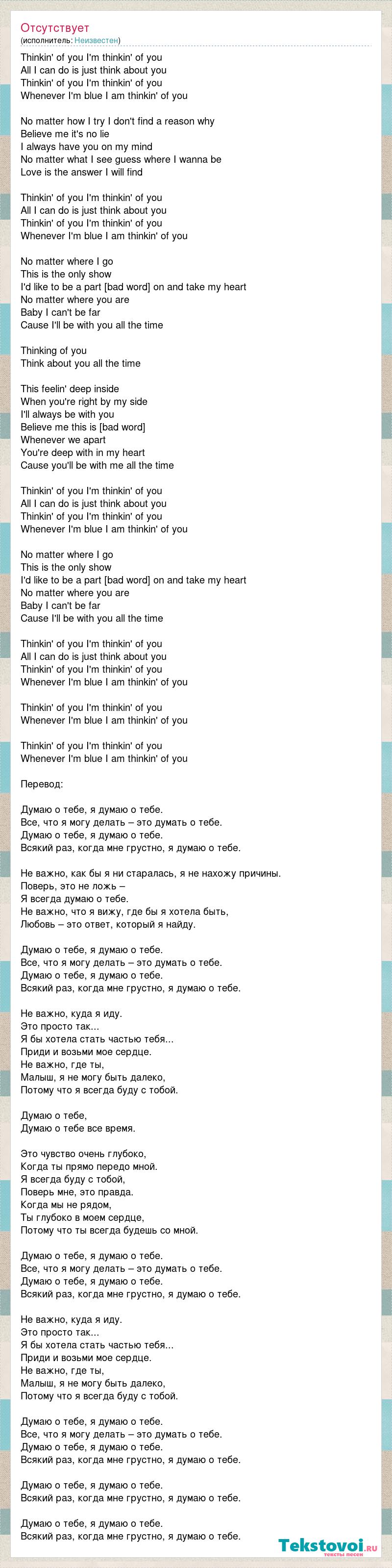 Thinkin' of you I'm thinkin' of you All I can do is just think about you Thinkin' of you I'm thinkin' of you Whenever I'm blue I am thinkin' of you No matter how I try I don't find a reason why Believe me it's no lie I always have you on my mind No matter what I see guess where I wanna be Love is the answer I will find Thinkin' of you I'm thinkin' of you All I can do is just think about you Thinkin' of you I'm thinkin' of you Whenever I'm blue I am thinkin' of you No matter where I go This is the only show I'd like to be a part [bad word] on and take my heart No matter where you are Baby I can't be far Cause I'll be with you all the time Thinking of you Think about you all the time This feelin' deep inside When you're right by my side I'll always be with you Believe me this is [bad word] Whenever we apart You're deep with in my heart Cause you'll be with me all the time Thinkin' of you I'm thinkin' of you All I can do is just think about you Thinkin' of you I'm thinkin' of you Whenever I'm blue I am thinkin' of you No matter where I go This is the only show I'd like to be a part [bad word] on and take my heart No matter where you are Baby I can't be far Cause I'll be with you all the time Thinkin' of you I'm thinkin' of you All I can do is just think about you Thinkin' of you I'm thinkin' of you Whenever I'm blue I am thinkin' of you Thinkin' of you I'm thinkin' of you Whenever I'm blue I am thinkin' of you Thinkin' of you I'm thinkin' of you Whenever I'm blue I am thinkin' of you Перевод: Думаю о тебе, я думаю о тебе. Все, что я могу делать – это думать о тебе. Думаю о тебе, я думаю о тебе. Всякий раз, когда мне грустно, я думаю о тебе. Не важно, как бы я ни старалась, я не нахожу причины. Поверь, это не ложь – Я всегда думаю о тебе. Не важно, что я вижу, где бы я хотела быть, Любовь – это ответ, который я найду. Думаю о тебе, я думаю о тебе. Все, что я могу делать – это думать о тебе. Думаю о тебе, я думаю о тебе. Всякий раз, когда мне грустно, я думаю о тебе. Не важно, куда я иду. Это просто так... Я бы хотела стать частью тебя... Приди и возьми мое сердце. Не важно, где ты, Малыш, я не могу быть далеко, Потому что я всегда буду с тобой. Думаю о тебе, Думаю о тебе все время. Это чувство очень глубоко, Когда ты прямо передо мной. Я всегда буду с тобой, Поверь мне, это правда. Когда мы не рядом, Ты глубоко в моем сердце, Потому что ты всегда будешь со мной. Думаю о тебе, я думаю о тебе. Все, что я могу делать – это думать о тебе. Думаю о тебе, я думаю о тебе. Всякий раз, когда мне грустно, я думаю о тебе. Не важно, куда я иду. Это просто так... Я бы хотела стать частью тебя... Приди и возьми мое сердце. Не важно, где ты, Малыш, я не могу быть далеко, Потому что я всегда буду с тобой. Думаю о тебе, я думаю о тебе. Все, что я могу делать – это думать о тебе. Думаю о тебе, я думаю о тебе. Всякий раз, когда мне грустно, я думаю о тебе. Думаю о тебе, я думаю о тебе. Всякий раз, когда мне грустно, я думаю о тебе. Думаю о тебе, я думаю о тебе. Всякий раз, когда мне грустно, я думаю о тебе.