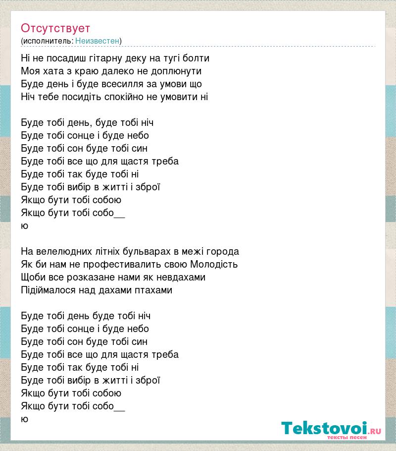 Ні не посадиш гітарну деку на тугі болти Моя хата з краю далеко не доплюнути Буде день і буде всесилля за умови що Ніч тебе посидіть спокійно не умовити ні Буде тобі день, буде тобі ніч Буде тобі сонце і буде небо Буде тобі сон буде тобі син Буде тобі все що для щастя треба Буде тобі так буде тобі ні Буде тобі вибір в житті і зброї Якщо бути тобі собою Якщо бути тобі собо__ ю На велелюдних літніх бульварах в межі города Як би нам не профестивалить свою Молодість Щоби все розказане нами як невдахами Підіймалося над дахами птахами Буде тобі день буде тобі ніч Буде тобі сонце і буде небо Буде тобі сон буде тобі син Буде тобі все що для щастя треба Буде тобі так буде тобі ні Буде тобі вибір в житті і зброї Якщо бути тобі собою Якщо бути тобі собо__ ю