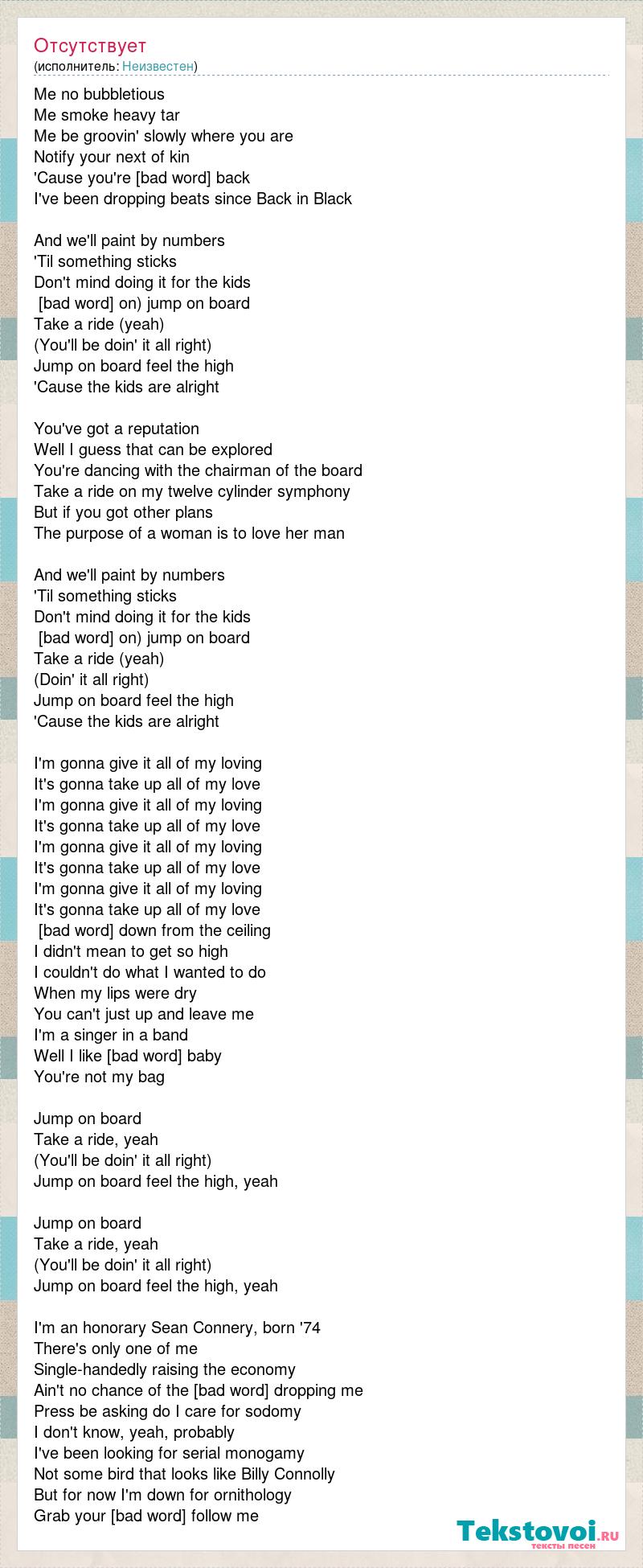 Me no bubbletious Me smoke heavy tar Me be groovin' slowly where you are Notify your next of kin 'Cause you're [bad word] back I've been dropping beats since Back in Black And we'll paint by numbers 'Til something sticks Don't mind doing it for the kids [bad word] on) jump on board Take a ride (yeah) (You'll be doin' it all right) Jump on board feel the high 'Cause the kids are alright You've got a reputation Well I guess that can be explored You're dancing with the chairman of the board Take a ride on my twelve cylinder symphony But if you got other plans The purpose of a woman is to love her man And we'll paint by numbers 'Til something sticks Don't mind doing it for the kids [bad word] on) jump on board Take a ride (yeah) (Doin' it all right) Jump on board feel the high 'Cause the kids are alright I'm gonna give it all of my loving It's gonna take up all of my love I'm gonna give it all of my loving It's gonna take up all of my love I'm gonna give it all of my loving It's gonna take up all of my love I'm gonna give it all of my loving It's gonna take up all of my love [bad word] down from the ceiling I didn't mean to get so high I couldn't do what I wanted to do When my lips were dry You can't just up and leave me I'm a singer in a band Well I like [bad word] baby You're not my bag Jump on board Take a ride, yeah (You'll be doin' it all right) Jump on board feel the high, yeah Jump on board Take a ride, yeah (You'll be doin' it all right) Jump on board feel the high, yeah I'm an honorary Sean Connery, born '74 There's only one of me Single-handedly raising the economy Ain't no chance of the [bad word] dropping me Press be asking do I care for sodomy I don't know, yeah, probably I've been looking for serial monogamy Not some bird that looks like Billy Connolly But for now I'm down for ornithology Grab your [bad word] follow me