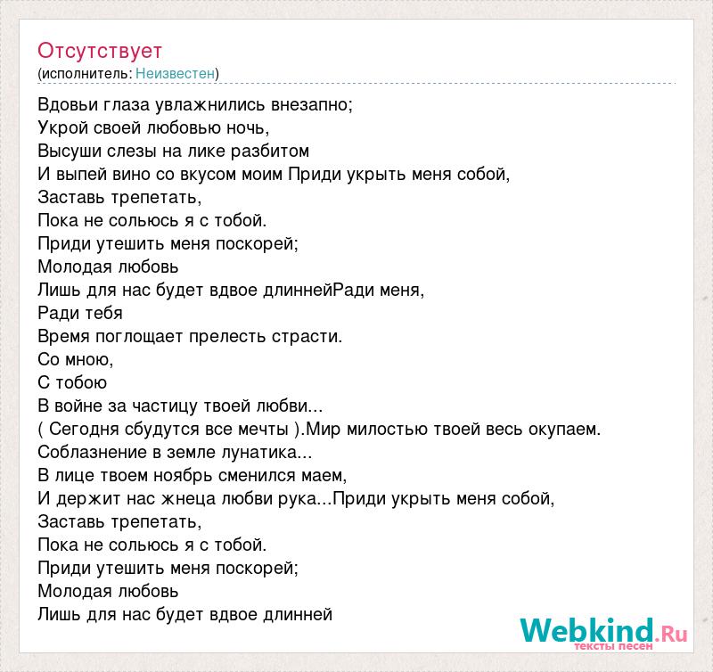 Вдовьи глаза увлажнились внезапно; Укрой своей любовью ночь, Высуши слезы на лике разбитом И выпей вино со вкусом моим Приди укрыть меня собой, Заставь трепетать, Пока не сольюсь я с тобой. Приди утешить меня поскорей; Молодая любовь Лишь для нас будет вдвое длиннейРади меня, Ради тебя Время поглощает прелесть страсти. Со мною, С тобою В войне за частицу твоей любви... ( Сегодня сбудутся все мечты ).Мир милостью твоей весь окупаем. Соблазнение в земле лунатика... В лице твоем ноябрь сменился маем, И держит нас жнеца любви рука...Приди укрыть меня собой, Заставь трепетать, Пока не сольюсь я с тобой. Приди утешить меня поскорей; Молодая любовь Лишь для нас будет вдвое длинней