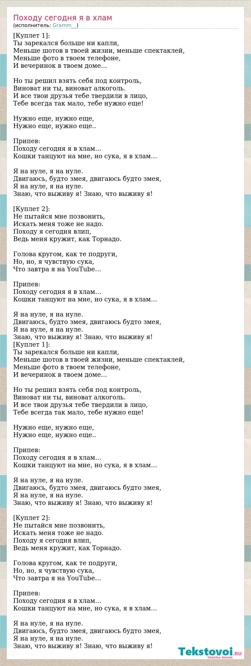 [Куплет 1]: Ты зарекался больше ни капли, Меньше шотов в твоей жизни, меньше спектаклей, Меньше фото в твоем телефоне, И вечеринок в твоем доме… Но ты решил взять себя под контроль, Виноват ни ты, виноват алкоголь. И все твои друзья тебе твердили в лицо, Тебе всегда так мало, тебе нужно еще! Нужно еще, нужно еще, Нужно еще, нужно еще.. Припев: Походу сегодня я в хлам… Кошки танцуют на мне, но сука, я в хлам… Я на нуле, я на нуле. Двигаюсь, будто змея, двигаюсь будто змея, Я на нуле, я на нуле. Знаю, что выживу я! Знаю, что выживу я! [Куплет 2]: Не пытайся мне позвонить, Искать меня тоже не надо. Походу я сегодня влип, Ведь меня кружит, как Торнадо. Голова кругом, как те подруги, Но, но, я чувствую сука, Что завтра я на YouTube… Припев: Походу сегодня я в хлам… Кошки танцуют на мне, но сука, я в хлам… Я на нуле, я на нуле. Двигаюсь, будто змея, двигаюсь будто змея, Я на нуле, я на нуле. Знаю, что выживу я! Знаю, что выживу я! [Куплет 1]: Ты зарекался больше ни капли, Меньше шотов в твоей жизни, меньше спектаклей, Меньше фото в твоем телефоне, И вечеринок в твоем доме… Но ты решил взять себя под контроль, Виноват ни ты, виноват алкоголь. И все твои друзья тебе твердили в лицо, Тебе всегда так мало, тебе нужно еще! Нужно еще, нужно еще, Нужно еще, нужно еще.. Припев: Походу сегодня я в хлам… Кошки танцуют на мне, но сука, я в хлам… Я на нуле, я на нуле. Двигаюсь, будто змея, двигаюсь будто змея, Я на нуле, я на нуле. Знаю, что выживу я! Знаю, что выживу я! [Куплет 2]: Не пытайся мне позвонить, Искать меня тоже не надо. Походу я сегодня влип, Ведь меня кружит, как Торнадо. Голова кругом, как те подруги, Но, но, я чувствую сука, Что завтра я на YouTube… Припев: Походу сегодня я в хлам… Кошки танцуют на мне, но сука, я в хлам… Я на нуле, я на нуле. Двигаюсь, будто змея, двигаюсь будто змея, Я на нуле, я на нуле. Знаю, что выживу я! Знаю, что выживу я!