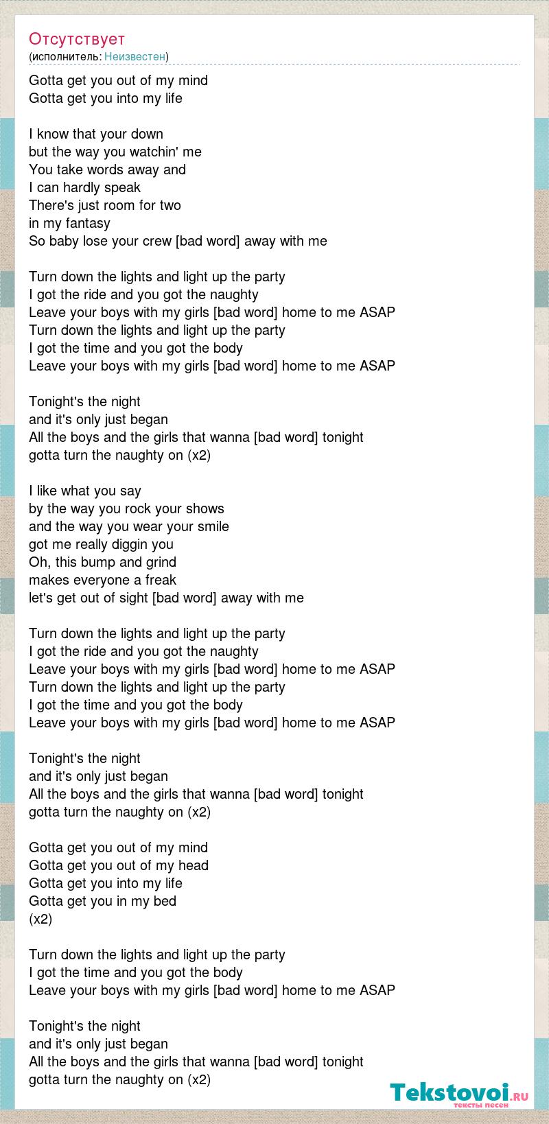 Gotta get you out of my mind Gotta get you into my life I know that your down but the way you watchin' me You take words away and I can hardly speak There's just room for two in my fantasy So baby lose your crew [bad word] away with me Turn down the lights and light up the party I got the ride and you got the naughty Leave your boys with my girls [bad word] home to me ASAP Turn down the lights and light up the party I got the time and you got the body Leave your boys with my girls [bad word] home to me ASAP Tonight's the night and it's only just began All the boys and the girls that wanna [bad word] tonight gotta turn the naughty on (x2) I like what you say by the way you rock your shows and the way you wear your smile got me really diggin you Oh, this bump and grind makes everyone a freak let's get out of sight [bad word] away with me Turn down the lights and light up the party I got the ride and you got the naughty Leave your boys with my girls [bad word] home to me ASAP Turn down the lights and light up the party I got the time and you got the body Leave your boys with my girls [bad word] home to me ASAP Tonight's the night and it's only just began All the boys and the girls that wanna [bad word] tonight gotta turn the naughty on (x2) Gotta get you out of my mind Gotta get you out of my head Gotta get you into my life Gotta get you in my bed (x2) Turn down the lights and light up the party I got the time and you got the body Leave your boys with my girls [bad word] home to me ASAP Tonight's the night and it's only just began All the boys and the girls that wanna [bad word] tonight gotta turn the naughty on (x2)