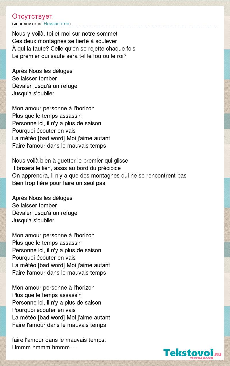 Nous-y voilà, toi et moi sur notre sommet Ces deux montagnes se fierté à soulever À qui la faute? Celle qu'on se rejette chaque fois Le premier qui saute sera t-il le fou ou le roi? Après Nous les déluges Se laisser tomber Dévaler jusqu'à un refuge Jusqu'à s'oublier Mon amour personne à l'horizon Plus que le temps assassin Personne ici, il n'y a plus de saison Pourquoi écouter en vais La météo [bad word] Moi j'aime autant Faire l'amour dans le mauvais temps Nous voilà bien à guetter le premier qui glisse Il brisera le lien, assis au bord du précipice On apprendra, il n'y a que des montagnes qui ne se rencontrent pas Bien trop fière pour faire un seul pas Après Nous les déluges Se laisser tomber Dévaler jusqu'à un refuge Jusqu'à s'oublier Mon amour personne à l'horizon Plus que le temps assassin Personne ici, il n'y a plus de saison Pourquoi écouter en vais La météo [bad word] Moi j'aime autant Faire l'amour dans le mauvais temps Mon amour personne à l'horizon Plus que le temps assassin Personne ici, il n'y a plus de saison Pourquoi écouter en vais La météo [bad word] Moi j'aime autant Faire l'amour dans le mauvais temps faire l'amour dans le mauvais temps. Hmmm hmmm hmmm....