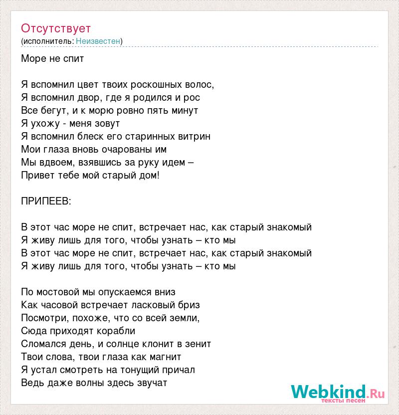 Море не спит Я вспомнил цвет твоих роскошных волос, Я вспомнил двор, где я родился и рос Все бегут, и к морю ровно пять минут Я ухожу - меня зовут Я вспомнил блеск его старинных витрин Мои глаза вновь очарованы им Мы вдвоем, взявшись за руку идем – Привет тебе мой старый дом! ПРИПЕЕВ: В этот час море не спит, встречает нас, как старый знакомый Я живу лишь для того, чтобы узнать – кто мы В этот час море не спит, встречает нас, как старый знакомый Я живу лишь для того, чтобы узнать – кто мы По мостовой мы опускаемся вниз Как часовой встречает ласковый бриз Посмотри, похоже, что со всей земли, Сюда приходят корабли Сломался день, и солнце клонит в зенит Твои слова, твои глаза как магнит Я устал смотреть на тонущий причал Ведь даже волны здесь звучат