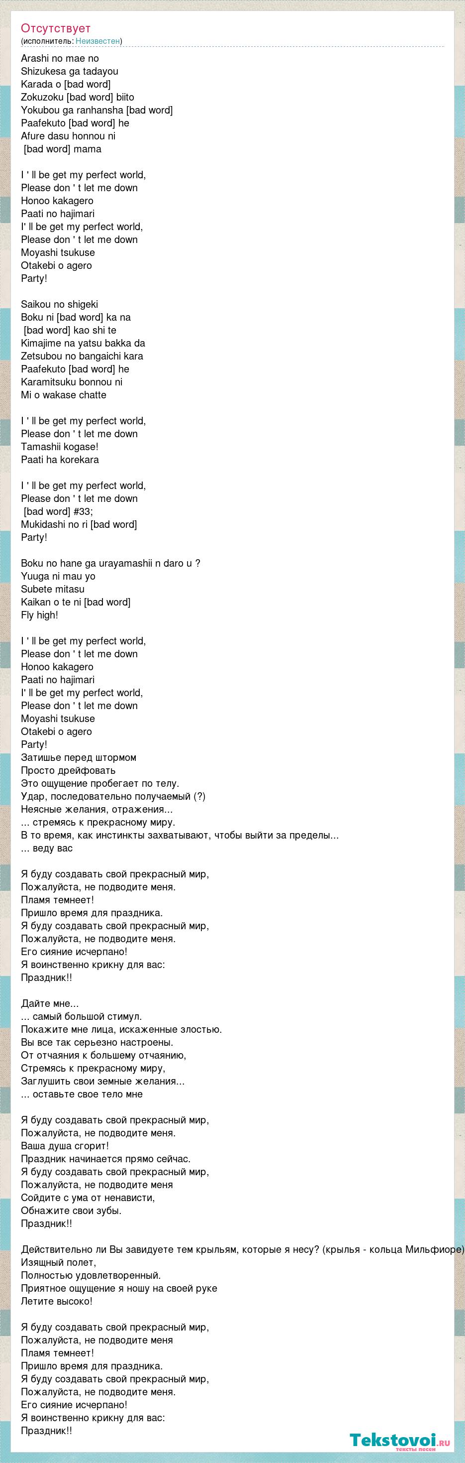 Arashi no mae no Shizukesa ga tadayou Karada o [bad word] Zokuzoku [bad word] biito Yokubou ga ranhansha [bad word] Paafekuto [bad word] he Afure dasu honnou ni [bad word] mama I ' ll be get my perfect world, Please don ' t let me down Honoo kakagero Paati no hajimari I' ll be get my perfect world, Please don ' t let me down Moyashi tsukuse Otakebi o agero Party! Saikou no shigeki Boku ni [bad word] ka na [bad word] kao shi te Kimajime na yatsu bakka da Zetsubou no bangaichi kara Paafekuto [bad word] he Karamitsuku bonnou ni Mi o wakase chatte I ' ll be get my perfect world, Please don ' t let me down Tamashii kogase! Paati ha korekara I ' ll be get my perfect world, Please don ' t let me down [bad word] #33; Mukidashi no ri [bad word] Party! Boku no hane ga urayamashii n daro u ? Yuuga ni mau yo Subete mitasu Kaikan o te ni [bad word] Fly high! I ' ll be get my perfect world, Please don ' t let me down Honoo kakagero Paati no hajimari I' ll be get my perfect world, Please don ' t let me down Moyashi tsukuse Otakebi o agero Party! Затишье перед штормом Просто дрейфовать Это ощущение пробегает по телу. Удар, последовательно получаемый (?) Неясные желания, отражения... ... стремясь к прекрасному миру. В то время, как инстинкты захватывают, чтобы выйти за пределы... ... веду вас Я буду создавать свой прекрасный мир, Пожалуйста, не подводите меня. Пламя темнеет! Пришло время для праздника. Я буду создавать свой прекрасный мир, Пожалуйста, не подводите меня. Его сияние исчерпано! Я воинственно крикну для вас: Праздник!! Дайте мне... ... самый большой стимул. Покажите мне лица, искаженные злостью. Вы все так серьезно настроены. От отчаяния к большему отчаянию, Стремясь к прекрасному миру, Заглушить свои земные желания... ... оставьте свое тело мне Я буду создавать свой прекрасный мир, Пожалуйста, не подводите меня. Ваша душа сгорит! Праздник начинается прямо сейчас. Я буду создавать свой прекрасный мир, Пожалуйста, не подводите меня Сойдите с ума от ненависти, Обнажите свои зубы. Праздник!! Действительно ли Вы завидуете тем крыльям, которые я несу? (крылья - кольца Мильфиоре) Изящный полет, Полностью удовлетворенный. Приятное ощущение я ношу на своей руке Летите высоко! Я буду создавать свой прекрасный мир, Пожалуйста, не подводите меня Пламя темнеет! Пришло время для праздника. Я буду создавать свой прекрасный мир, Пожалуйста, не подводите меня. Его сияние исчерпано! Я воинственно крикну для вас: Праздник!!