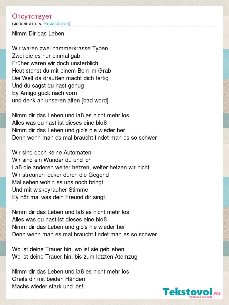 Nimm Dir das Leben Wir waren zwei hammerkrasse Typen Zwei die es nur einmal gab Früher waren wir doch unsterblich Heut stehst du mit einem Bein im Grab Die Welt da draußen macht dich fertig Und du sagst du hast genug Ey Amigo guck nach vorn und denk an unseren alten [bad word] Nimm dir das Leben und laß es nicht mehr los Alles was du hast ist dieses eine bloß Nimm dir das Leben und gib’s nie wieder her Denn wenn man es mal braucht findet man es so schwer Wir sind doch keine Automaten Wir sind ein Wunder du und ich Laß die anderen weiter hetzen, weiter hetzen wir nicht Wir streunen locker durch die Gegend Mal sehen wohin es uns noch bringt Und mit wiskeyrauher Stimme Ey hör mal was dein Freund dir singt: Nimm dir das Leben und laß es nicht mehr los Alles was du hast ist dieses eine bloß Nimm dir das Leben und gib’s nie wieder her Denn wenn man es mal braucht findet man es so schwer Wo ist deine Trauer hin, wo ist sie geblieben Wo ist deine Trauer hin, bis zum letzten Atemzug Nimm dir das Leben und laß es nicht mehr los Greifs dir mit beiden Händen Machs wieder stark und los!