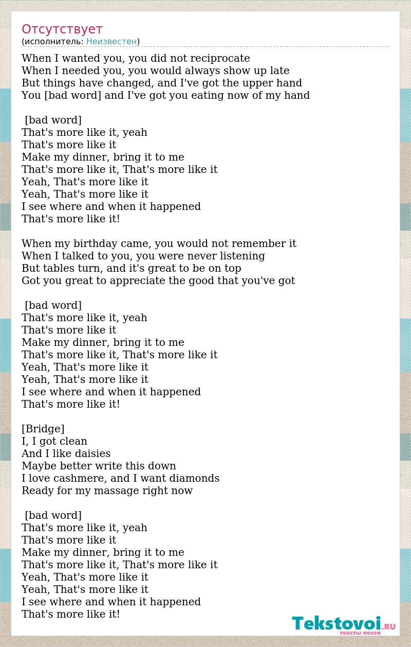 When I wanted you, you did not reciprocate When I needed you, you would always show up late But things have changed, and I've got the upper hand You [bad word] and I've got you eating now of my hand [bad word] That's more like it, yeah That's more like it Make my dinner, bring it to me That's more like it, That's more like it Yeah, That's more like it Yeah, That's more like it I see where and when it happened That's more like it! When my birthday came, you would not remember it When I talked to you, you were never listening But tables turn, and it's great to be on top Got you great to appreciate the good that you've got [bad word] That's more like it, yeah That's more like it Make my dinner, bring it to me That's more like it, That's more like it Yeah, That's more like it Yeah, That's more like it I see where and when it happened That's more like it! [Bridge] I, I got clean And I like daisies Maybe better write this down I love cashmere, and I want diamonds Ready for my massage right now [bad word] That's more like it, yeah That's more like it Make my dinner, bring it to me That's more like it, That's more like it Yeah, That's more like it Yeah, That's more like it I see where and when it happened That's more like it!