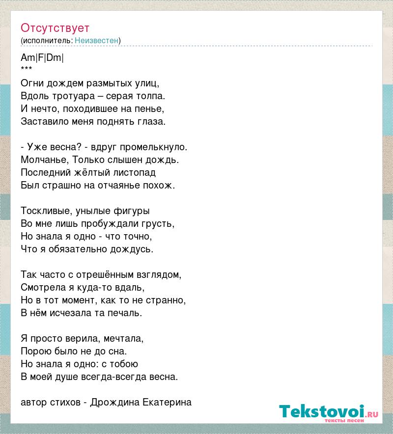 Am|F|Dm| *** Огни дождем размытых улиц, Вдоль тротуара – серая толпа. И нечто, походившее на пенье, Заставило меня поднять глаза. - Уже весна? - вдруг промелькнуло. Молчанье, Только слышен дождь. Последний жёлтый листопад Был страшно на отчаянье похож. Тоскливые, унылые фигуры Во мне лишь пробуждали грусть, Но знала я одно - что точно, Что я обязательно дождусь. Так часто с отрешённым взглядом, Смотрела я куда-то вдаль, Но в тот момент, как то не странно, В нём исчезала та печаль. Я просто верила, мечтала, Порою было не до сна. Но знала я одно: с тобою В моей душе всегда-всегда весна. автор стихов - Дрождина Екатерина