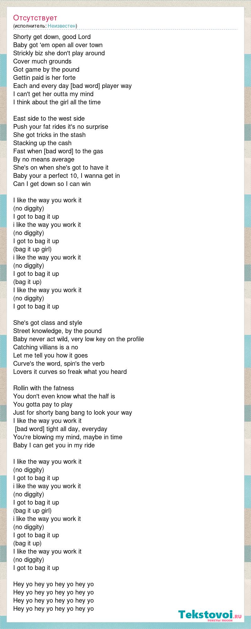 Shorty get down, good Lord Baby got 'em open all over town Strickly biz she don't play around Cover much grounds Got game by the pound Gettin paid is her forte Each and every day [bad word] player way I can't get her outta my mind I think about the girl all the time East side to the west side Push your fat rides it's no surprise She got tricks in the stash Stacking up the cash Fast when [bad word] to the gas By no means average She's on when she's got to have it Baby your a perfect 10, I wanna get in Can I get down so I can win I like the way you work it (no diggity) I got to bag it up i like the way you work it (no diggity) I got to bag it up (bag it up girl) i like the way you work it (no diggity) I got to bag it up (bag it up) I like the way you work it (no diggity) I got to bag it up She's got class and style Street knowledge, by the pound Baby never act wild, very low key on the profile Catching villians is a no Let me tell you how it goes Curve's the word, spin's the verb Lovers it curves so freak what you heard Rollin with the fatness You don't even know what the half is You gotta pay to play Just for shorty bang bang to look your way I like the way you work it [bad word] tight all day, everyday You're blowing my mind, maybe in time Baby I can get you in my ride I like the way you work it (no diggity) I got to bag it up i like the way you work it (no diggity) I got to bag it up (bag it up girl) i like the way you work it (no diggity) I got to bag it up (bag it up) I like the way you work it (no diggity) I got to bag it up Hey yo hey yo hey yo hey yo Hey yo hey yo hey yo hey yo Hey yo hey yo hey yo hey yo Hey yo hey yo hey yo hey yo