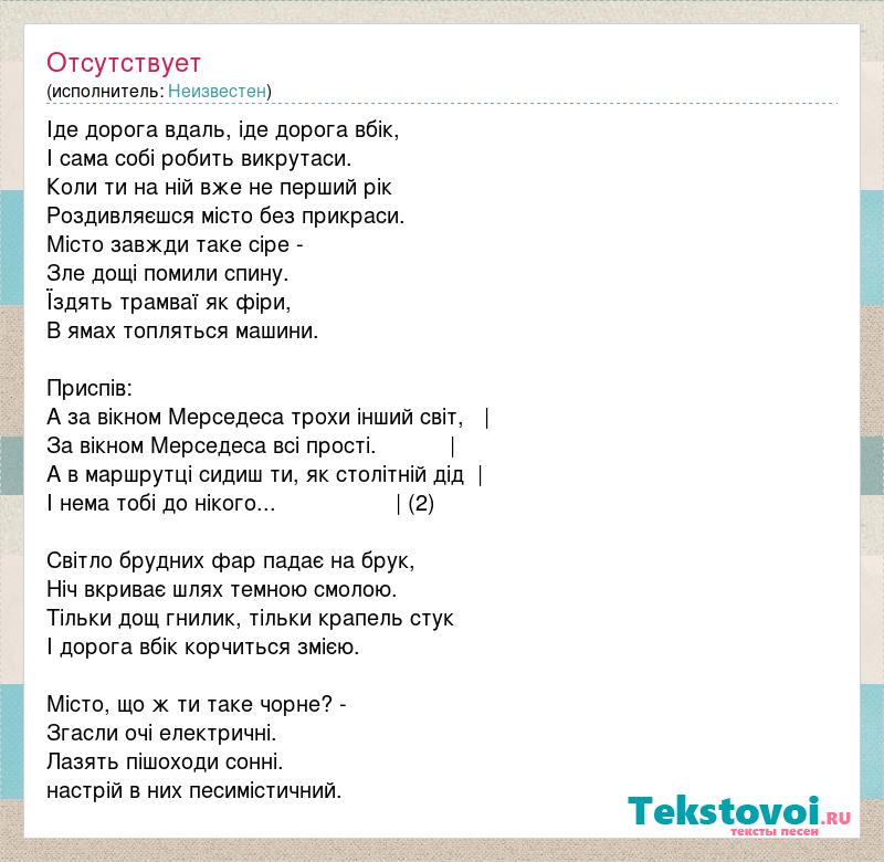 Іде дорога вдаль, іде дорога вбік, І сама собі робить викрутаси. Коли ти на ній вже не перший рік Роздивляєшся місто без прикраси. Місто завжди таке сіре - Зле дощі помили спину. Їздять трамваї як фіри, В ямах топляться машини. Приспів: А за вікном Мерседеса трохи інший світ, | За вікном Мерседеса всі прості. | А в маршрутці сидиш ти, як столітній дід | І нема тобі до нікого... | (2) Світло брудних фар падає на брук, Ніч вкриває шлях темною смолою. Тільки дощ гнилик, тільки крапель стук І дорога вбік корчиться змією. Місто, що ж ти таке чорне? - Згасли очі електричні. Лазять пішоходи сонні. настрій в них песимістичний.