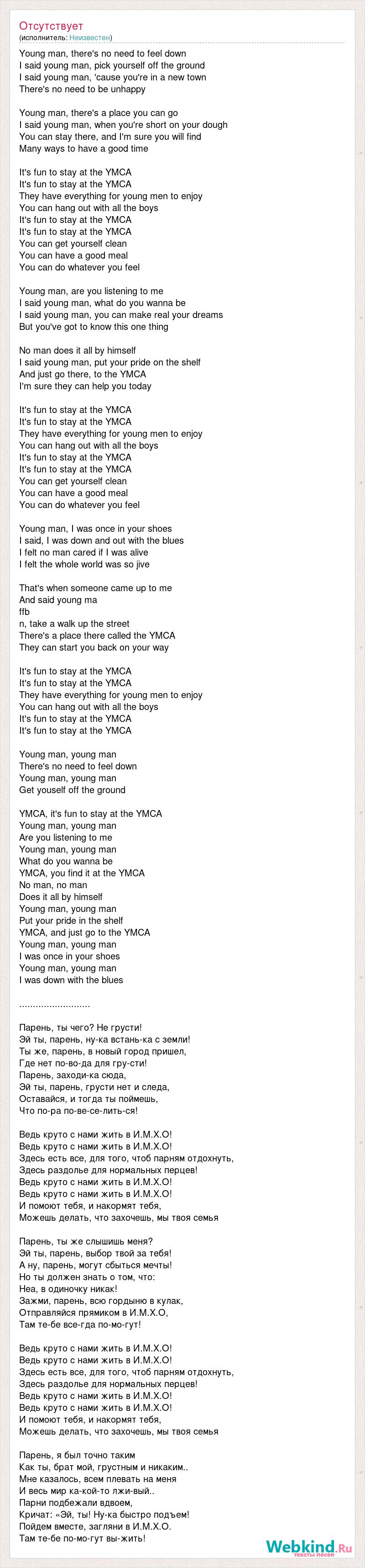 Young man, there's no need to feel down I said young man, pick yourself off the ground I said young man, 'cause you're in a new town There's no need to be unhappy Young man, there's a place you can go I said young man, when you're short on your dough You can stay there, and I'm sure you will find Many ways to have a good time It's fun to stay at the YMCA It's fun to stay at the YMCA They have everything for young men to enjoy You can hang out with all the boys It's fun to stay at the YMCA It's fun to stay at the YMCA You can get yourself clean You can have a good meal You can do whatever you feel Young man, are you listening to me I said young man, what do you wanna be I said young man, you can make real your dreams But you've got to know this one thing No man does it all by himself I said young man, put your pride on the shelf And just go there, to the YMCA I'm sure they can help you today It's fun to stay at the YMCA It's fun to stay at the YMCA They have everything for young men to enjoy You can hang out with all the boys It's fun to stay at the YMCA It's fun to stay at the YMCA You can get yourself clean You can have a good meal You can do whatever you feel Young man, I was once in your shoes I said, I was down and out with the blues I felt no man cared if I was alive I felt the whole world was so jive That's when someone came up to me And said young ma ffb n, take a walk up the street There's a place there called the YMCA They can start you back on your way It's fun to stay at the YMCA It's fun to stay at the YMCA They have everything for young men to enjoy You can hang out with all the boys It's fun to stay at the YMCA It's fun to stay at the YMCA Young man, young man There's no need to feel down Young man, young man Get youself off the ground YMCA, it's fun to stay at the YMCA Young man, young man Are you listening to me Young man, young man What do you wanna be YMCA, you find it at the YMCA No man, no man Does it all by himself Young man, young man Put your pride in the shelf YMCA, and just go to the YMCA Young man, young man I was once in your shoes Young man, young man I was down with the blues .......................... Парень, ты чего? Не грусти! Эй ты, парень, ну-ка встань-ка с земли! Ты же, парень, в новый город пришел, Где нет по-во-да для гру-сти! Парень, заходи-ка сюда, Эй ты, парень, грусти нет и следа, Оставайся, и тогда ты поймешь, Что по-ра по-ве-се-лить-ся! Ведь круто с нами жить в И.М.Х.О! Ведь круто с нами жить в И.М.Х.О! Здесь есть все, для того, чтоб парням отдохнуть, Здесь раздолье для нормальных перцев! Ведь круто с нами жить в И.М.Х.О! Ведь круто с нами жить в И.М.Х.О! И помоют тебя, и накормят тебя, Можешь делать, что захочешь, мы твоя семья Парень, ты же слышишь меня? Эй ты, парень, выбор твой за тебя! А ну, парень, могут сбыться мечты! Но ты должен знать о том, что: Неа, в одиночку никак! Зажми, парень, всю гордыню в кулак, Отправляйся прямиком в И.М.Х.О, Там те-бе все-гда по-мо-гут! Ведь круто с нами жить в И.М.Х.О! Ведь круто с нами жить в И.М.Х.О! Здесь есть все, для того, чтоб парням отдохнуть, Здесь раздолье для нормальных перцев! Ведь круто с нами жить в И.М.Х.О! Ведь круто с нами жить в И.М.Х.О! И помоют тебя, и накормят тебя, Можешь делать, что захочешь, мы твоя семья Парень, я был точно таким Как ты, брат мой, грустным и никаким.. Мне казалось, всем плевать на меня И весь мир ка-кой-то лжи-вый.. Парни подбежали вдвоем, Кричат: «Эй, ты! Ну-ка быстро подъем! Пойдем вместе, загляни в И.М.Х.О. Там те-бе по-мо-гут вы-жить!