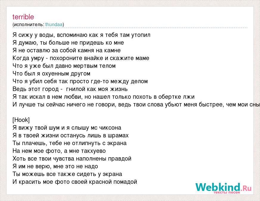 Я сижу у воды, вспоминаю как я тебя там утопил Я думаю, ты больше не придешь ко мне Я не оставлю за собой камня на камне Когда умру - похороните внайке и скажите маме Что я уже был давно мертвым телом Что был я охуенным другом Что я убил себя так просто где-то между делом Ведь этот город - гнилой как моя жизнь Я так искал в нем любви, но нашел только похоть в обертке лжи И лучше ты сейчас ничего не говори, ведь твои слова убьют меня быстрее, чем мои сны [Hook] Я вижу твой шум и я слышу мс чиксона Я в твоей жизни останусь лишь в шрамах Ты плачешь, тебе не отлипнуть с экрана На нем мое фото, а мне такхуево Хоть все твои чувства наполнены правдой Я им не верю, мне это не надо Ты можешь все также сидеть у экрана И красить мое фото своей красной помадой