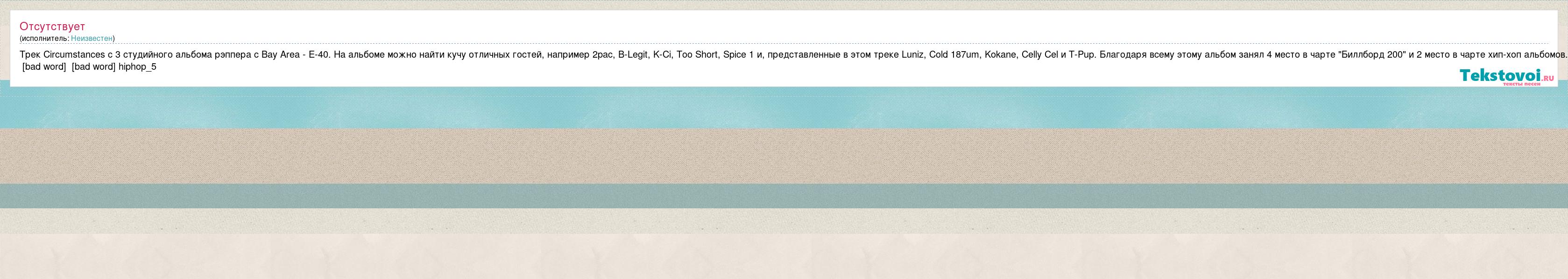 Трек Circumstances с 3 студийного альбома рэппера с Bay Area - E-40. На альбоме можно найти кучу отличных гостей, например 2pac, B-Legit, K-Ci, Too Short, Spice 1 и, представленные в этом треке Luniz, Cold 187um, Kokane, Celly Cel и T-Pup. Благодаря всему этому альбом занял 4 место в чарте "Биллборд 200" и 2 место в чарте хип-хоп альбомов. [bad word] [bad word] hiphop_5