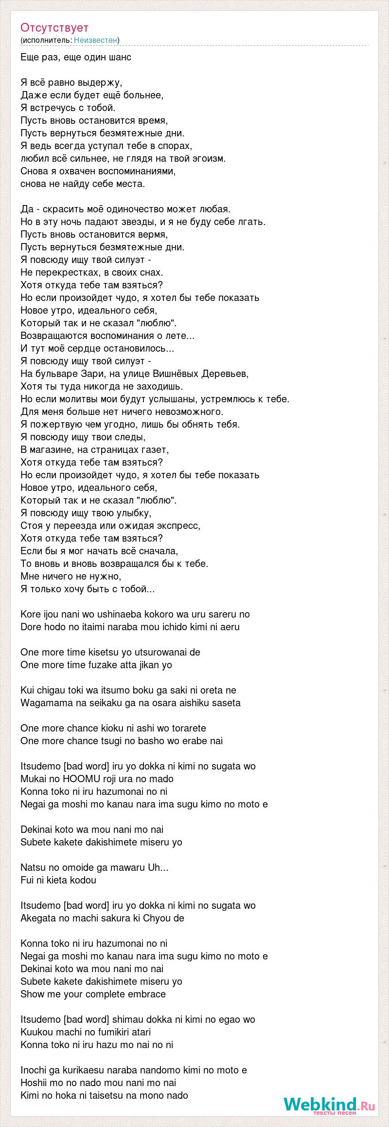 Еще раз, еще один шанс Я всё равно выдержу, Даже если будет ещё больнее, Я встречусь с тобой. Пусть вновь остановится время, Пусть вернуться безмятежные дни. Я ведь всегда уступал тебе в спорах, любил всё сильнее, не глядя на твой эгоизм. Снова я охвачен воспоминаниями, снова не найду себе места. Да - скрасить моё одиночество может любая. Но в эту ночь падают звезды, и я не буду себе лгать. Пусть вновь остановится вермя, Пусть вернуться безмятежные дни. Я повсюду ищу твой силуэт - Не перекрестках, в своих снах. Хотя откуда тебе там взяться? Но если произойдет чудо, я хотел бы тебе показать Новое утро, идеального себя, Который так и не сказал "люблю". Возвращаются воспоминания о лете... И тут моё сердце остановилось... Я повсюду ищу твой силуэт - На бульваре Зари, на улице Вишнёвых Деревьев, Хотя ты туда никогда не заходишь. Но если молитвы мои будут услышаны, устремлюсь к тебе. Для меня больше нет ничего невозможного. Я пожертвую чем угодно, лишь бы обнять тебя. Я повсюду ищу твои следы, В магазине, на страницах газет, Хотя откуда тебе там взяться? Но если произойдет чудо, я хотел бы тебе показать Новое утро, идеального себя, Который так и не сказал "люблю". Я повсюду ищу твою улыбку, Стоя у переезда или ожидая экспресс, Хотя откуда тебе там взяться? Если бы я мог начать всё сначала, То вновь и вновь возвращался бы к тебе. Мне ничего не нужно, Я только хочу быть с тобой... Kore ijou nani wo ushinaeba kokoro wa [bad word] sareru no Dore hodo no itaimi naraba mou ichido kimi ni [bad word] One more time kisetsu yo utsurowanai de One more time fuzake atta jikan yo Kui chigau toki wa itsumo boku ga saki ni oreta ne Wagamama na seikaku ga na osara aishiku saseta One more chance kioku ni ashi wo torarete One more chance tsugi no basho wo erabe nai Itsudemo [bad word] [bad word] yo dokka ni kimi no sugata wo Mukai no HOOMU roji ura no mado Konna toko ni [bad word] hazumonai no ni Negai ga moshi mo kanau nara ima sugu kimo no moto e Dekinai koto wa mou nani mo nai Subete kakete dakishimete [bad word] yo Natsu no omoide ga [bad word] Uh... Fui ni kieta kodou Itsudemo [bad word] [bad word] yo dokka ni kimi no sugata wo Akegata no machi sakura ki Chyou de Konna toko ni [bad word] hazumonai no ni Negai ga moshi mo kanau nara ima sugu kimo no moto e Dekinai koto wa mou nani mo nai Subete kakete dakishimete [bad word] yo Show me [bad word] embrace Itsudemo [bad word] shimau dokka ni kimi no egao wo Kuukou machi no fumikiri atari Konna toko ni [bad word] hazu mo nai no ni Inochi ga kurikaesu naraba nandomo kimi no moto e Hoshii mo no nado mou nani mo nai Kimi no hoka ni taisetsu na mono nado
