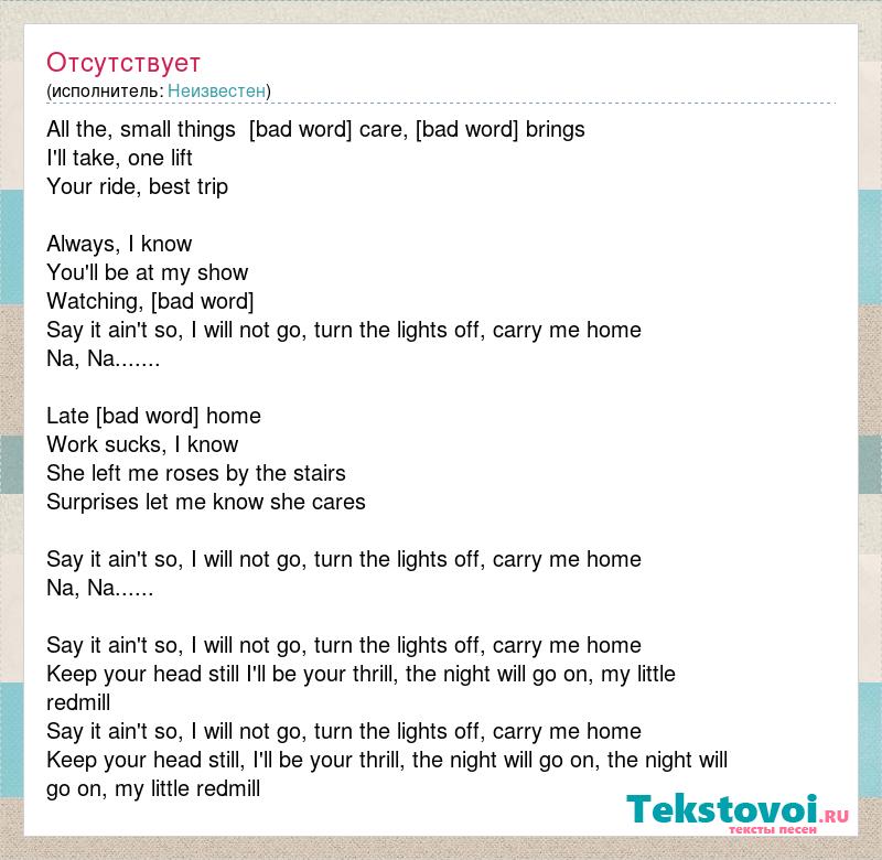 All the, small things [bad word] care, [bad word] brings I'll take, one lift Your ride, best trip Always, I know You'll be at my show Watching, [bad word] Say it ain't so, I will not go, turn the lights off, carry me home Na, Na....... Late [bad word] home Work sucks, I know She left me roses by the stairs Surprises let me know she cares Say it ain't so, I will not go, turn the lights off, carry me home Na, Na...... Say it ain't so, I will not go, turn the lights off, carry me home Keep your head still I'll be your thrill, the night will go on, my little redmill Say it ain't so, I will not go, turn the lights off, carry me home Keep your head still, I'll be your thrill, the night will go on, the night will go on, my little redmill