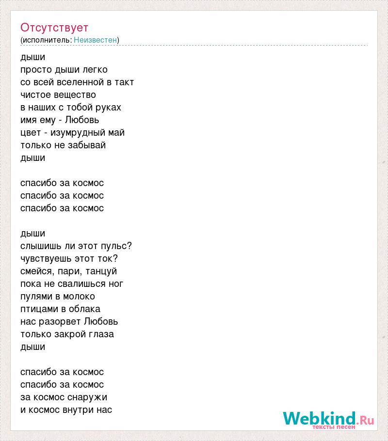 дыши просто дыши легко со всей вселенной в такт чистое вещество в наших с тобой руках имя ему - Любовь цвет - изумрудный май только не забывай дыши спасибо за космос спасибо за космос спасибо за космос дыши слышишь ли этот пульс? чувствуешь этот ток? смейся, пари, танцуй пока не свалишься ног пулями в молоко птицами в облака нас разорвет Любовь только закрой глаза дыши спасибо за космос спасибо за космос за космос снаружи и космос внутри нас