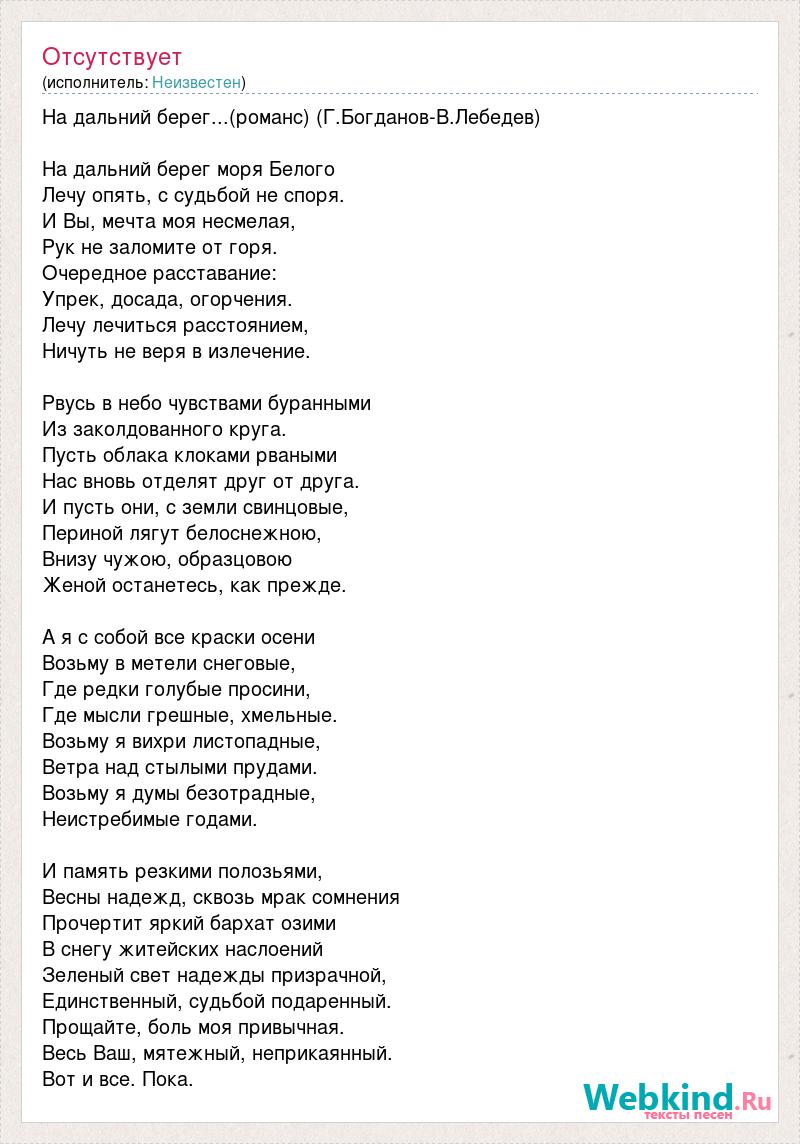 На дальний берег...(романс) (Г.Богданов-В.Лебедев) На дальний берег моря Белого Лечу опять, с судьбой не споря. И Вы, мечта моя несмелая, Рук не заломите от горя. Очередное расставание: Упрек, досада, огорчения. Лечу лечиться расстоянием, Ничуть не веря в излечение. Рвусь в небо чувствами буранными Из заколдованного круга. Пусть облака клоками рваными Нас вновь отделят друг от друга. И пусть они, с земли свинцовые, Периной лягут белоснежною, Внизу чужою, образцовою Женой останетесь, как прежде. А я с собой все краски осени Возьму в метели снеговые, Где редки голубые просини, Где мысли грешные, хмельные. Возьму я вихри листопадные, Ветра над стылыми прудами. Возьму я думы безотрадные, Неистребимые годами. И память резкими полозьями, Весны надежд, сквозь мрак сомнения Прочертит яркий бархат озими В снегу житейских наслоений Зеленый свет надежды призрачной, Единственный, судьбой подаренный. Прощайте, боль моя привычная. Весь Ваш, мятежный, неприкаянный. Вот и все. Пока.