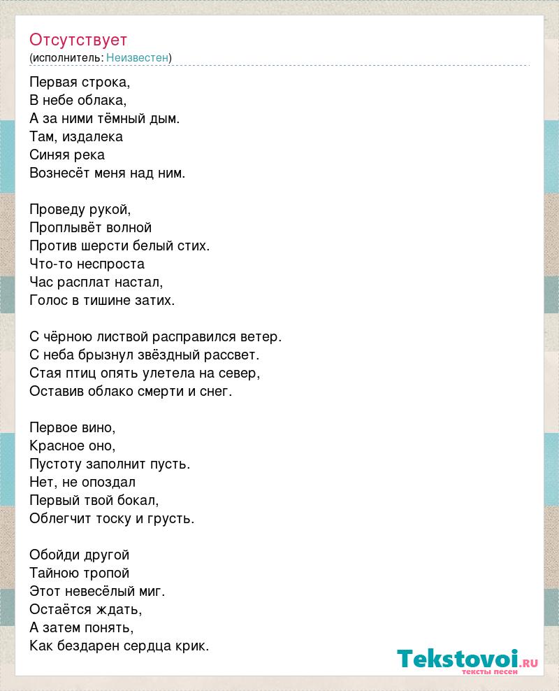 Первая строка, В небе облака, А за ними тёмный дым. Там, издалека Синяя река Вознесёт меня над ним. Проведу рукой, Проплывёт волной Против шерсти белый стих. Что-то неспроста Час расплат настал, Голос в тишине затих. С чёрною листвой расправился ветер. С неба брызнул звёздный рассвет. Стая птиц опять улетела на север, Оставив облако смерти и снег. Первое вино, Красное оно, Пустоту заполнит пусть. Нет, не опоздал Первый твой бокал, Облегчит тоску и грусть. Обойди другой Тайною тропой Этот невесёлый миг. Остаётся ждать, А затем понять, Как бездарен сердца крик.