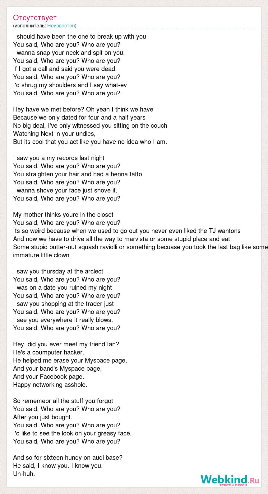 I should have been the one to break up with you You said, Who are you? Who are you? I wanna snap your neck and spit on you. You said, Who are you? Who are you? If I got a call and said you were dead You said, Who are you? Who are you? I'd [bad word] my shoulders and I say what-ev You said, Who are you? Who are you? Hey have we met before? Oh yeah I think we have Because we only dated for four and a half years No big deal, I've only witnessed you sitting on the couch Watching Next in your undies, But its cool that you act like you have no idea who I am. I saw you a my records last night You said, Who are you? Who are you? You straighten your hair and had a henna tatto You said, Who are you? Who are you? I wanna shove your face just shove it. You said, Who are you? Who are you? My mother thinks youre in the closet You said, Who are you? Who are you? Its so weird because when we used to go out you never even liked the TJ wantons And now we have to drive all the way to marvista or some stupid place and eat Some stupid butter-nut squash raviolli or something becuase you took the last bag like some immature little clown. I saw you thursday at the arclect You said, Who are you? Who are you? I was on a date [bad word] my night You said, Who are you? Who are you? I saw you shopping at the trader just You said, Who are you? Who are you? I see you everywhere it really blows. You said, Who are you? Who are you? Hey, did you ever meet my friend Ian? He's a coumputer hacker. He helped me erase your Myspace page, And your band's Myspace page, And your Facebook page. Happy networking [bad word] So rememebr all the stuff you forgot You said, Who are you? Who are you? After you just bought. You said, Who are you? Who are you? I'd like to see the look on your greasy face. You said, Who are you? Who are you? And so for sixteen hundy on audi base? He said, I know you. I know you. Uh-huh.