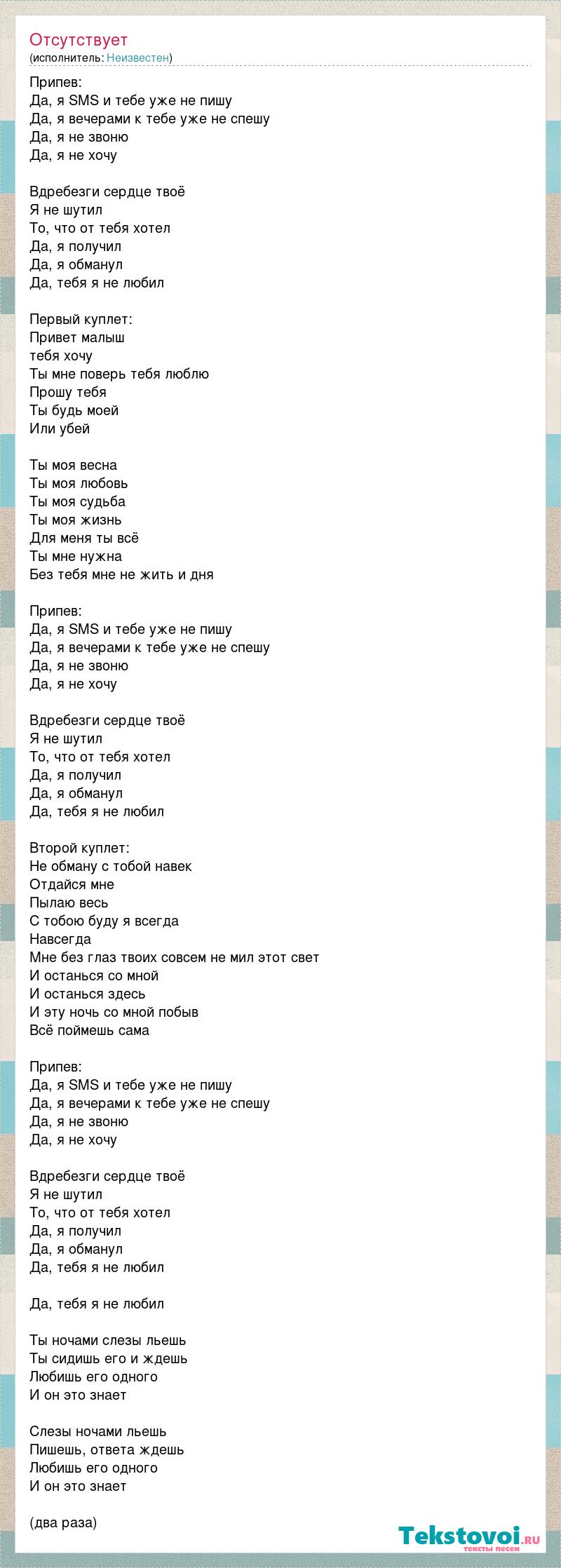 Припев: Да, я SMS и тебе уже не пишу Да, я вечерами к тебе уже не спешу Да, я не звоню Да, я не хочу Вдребезги сердце твоё Я не шутил То, что от тебя хотел Да, я получил Да, я обманул Да, тебя я не любил Первый куплет: Привет малыш тебя хочу Ты мне поверь тебя люблю Прошу тебя Ты будь моей Или убей Ты моя весна Ты моя любовь Ты моя судьба Ты моя жизнь Для меня ты всё Ты мне нужна Без тебя мне не жить и дня Припев: Да, я SMS и тебе уже не пишу Да, я вечерами к тебе уже не спешу Да, я не звоню Да, я не хочу Вдребезги сердце твоё Я не шутил То, что от тебя хотел Да, я получил Да, я обманул Да, тебя я не любил Второй куплет: Не обману с тобой навек Отдайся мне Пылаю весь С тобою буду я всегда Навсегда Мне без глаз твоих совсем не мил этот свет И останься со мной И останься здесь И эту ночь со мной побыв Всё поймешь сама Припев: Да, я SMS и тебе уже не пишу Да, я вечерами к тебе уже не спешу Да, я не звоню Да, я не хочу Вдребезги сердце твоё Я не шутил То, что от тебя хотел Да, я получил Да, я обманул Да, тебя я не любил Да, тебя я не любил Ты ночами слезы льешь Ты сидишь его и ждешь Любишь его одного И он это знает Слезы ночами льешь Пишешь, ответа ждешь Любишь его одного И он это знает (два раза)