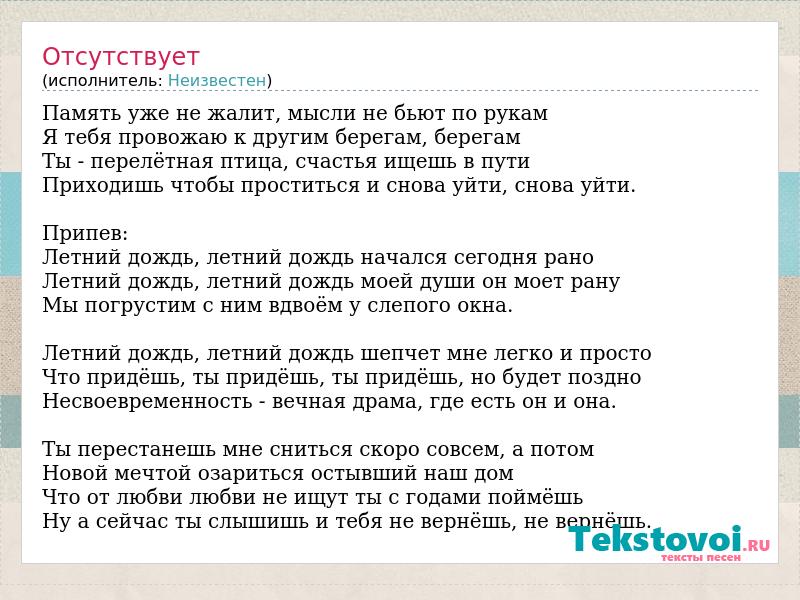 Память уже не жалит, мысли не бьют по рукам Я тебя провожаю к другим берегам, берегам Ты - перелётная птица, счастья ищешь в пути Приходишь чтобы проститься и снова уйти, снова уйти. Припев: Летний дождь, летний дождь начался сегодня рано Летний дождь, летний дождь моей души он моет рану Мы погрустим с ним вдвоём у слепого окна. Летний дождь, летний дождь шепчет мне легко и просто Что придёшь, ты придёшь, ты придёшь, но будет поздно Несвоевременность - вечная драма, где есть он и она. Ты перестанешь мне сниться скоро совсем, а потом Новой мечтой озариться остывший наш дом Что от любви любви не ищут ты с годами поймёшь Ну а сейчас ты слышишь и тебя не вернёшь, не вернёшь.
